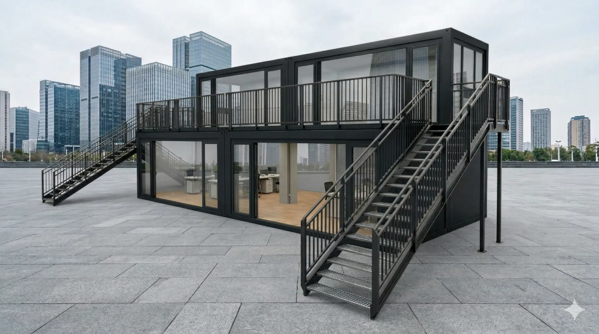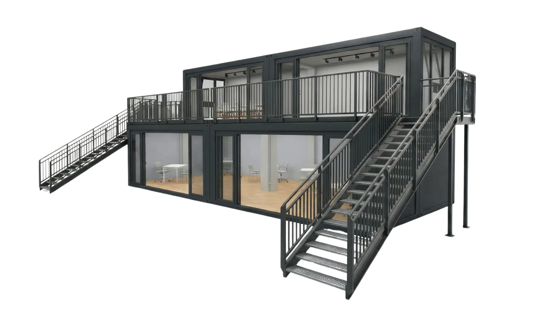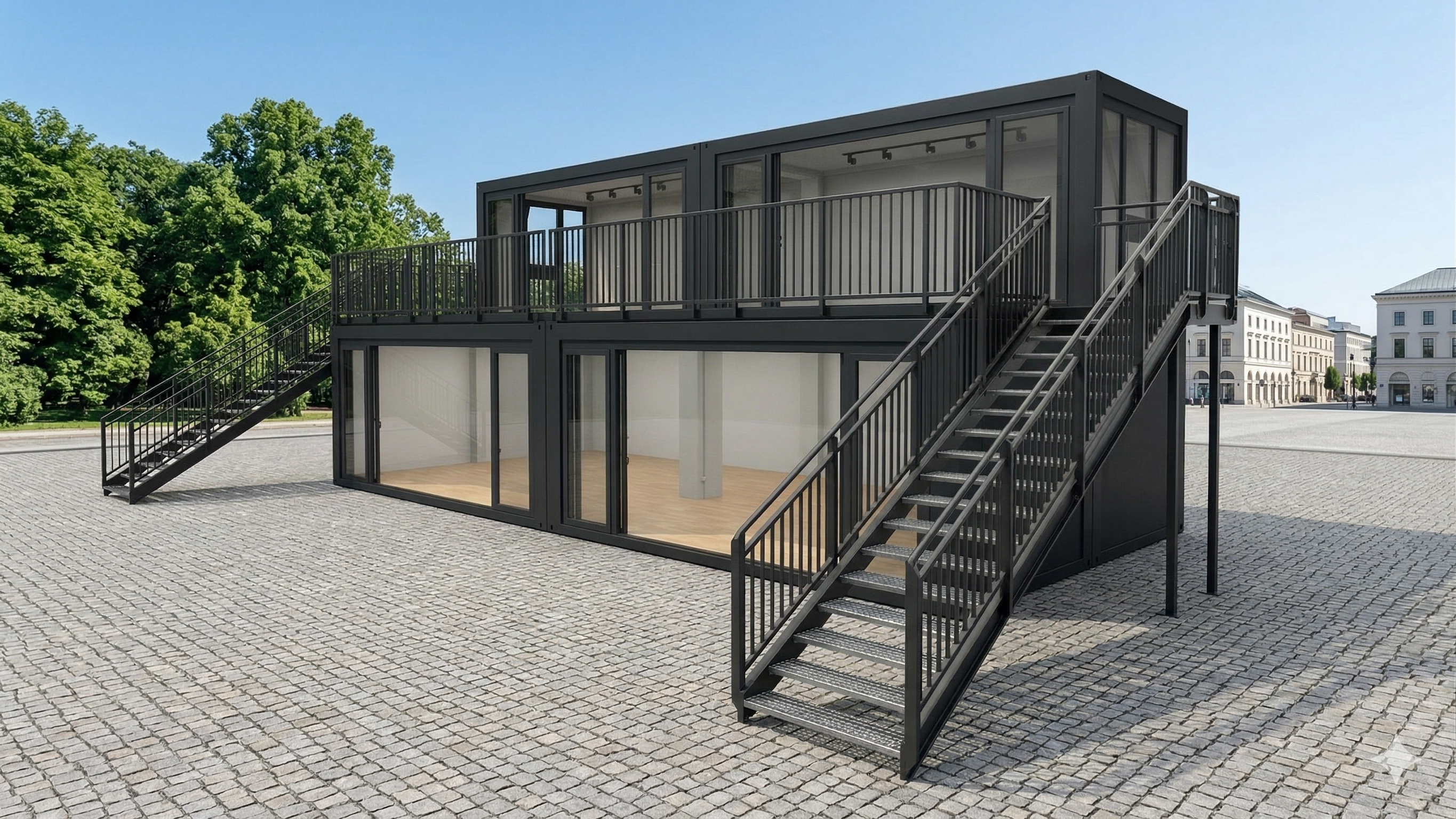 Eventcontainer Entwurf 106 kombiniert modernes Design mit funktionaler Flexibilität und schafft einen eindrucksvollen Raum für Veranstaltungen jeder Art. Die großzügig verglasten Fronten mit breiten Schiebetüren sorgen für eine lichtdurchflutete und offene Atmosphäre, die Exponate und Präsentationen optimal in Szene setzt.