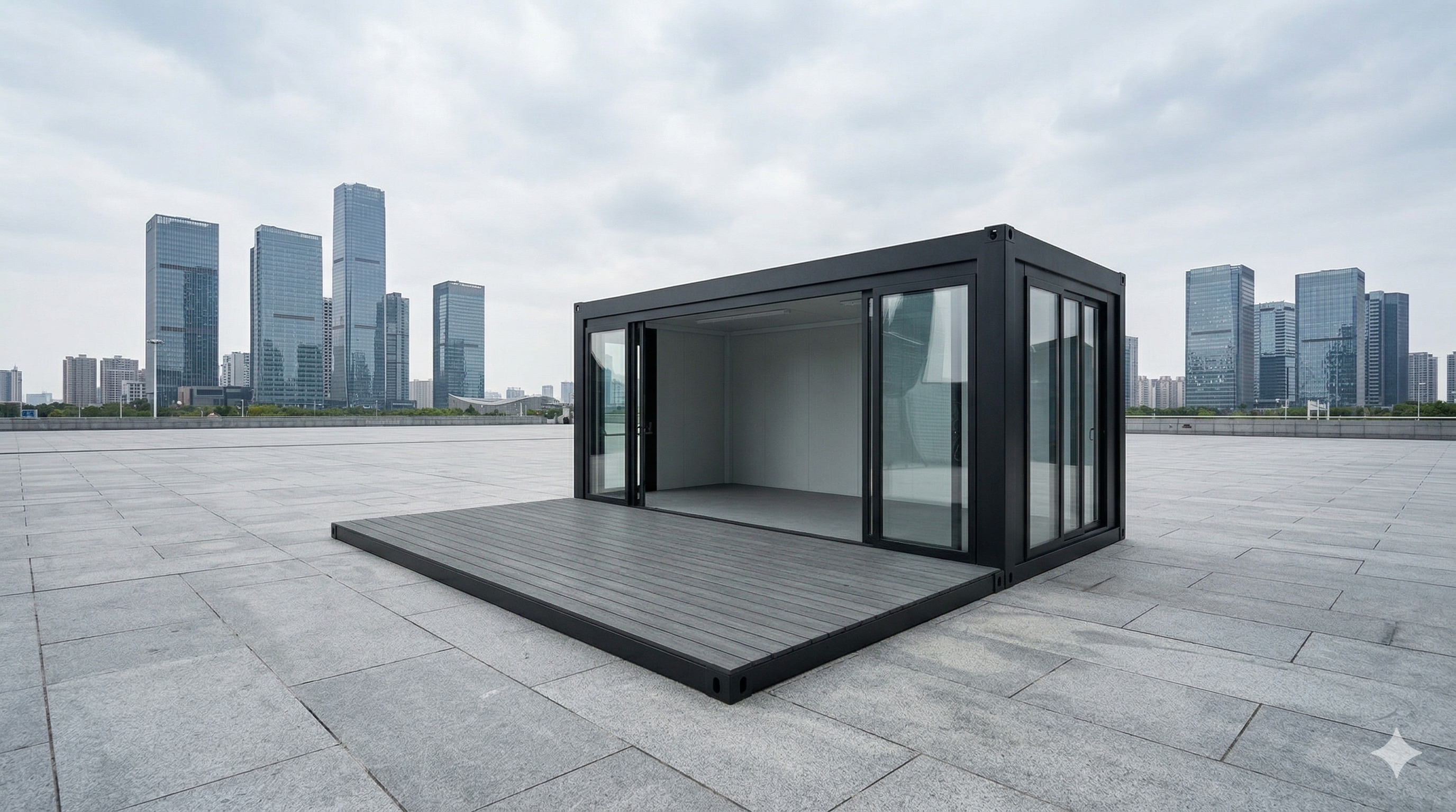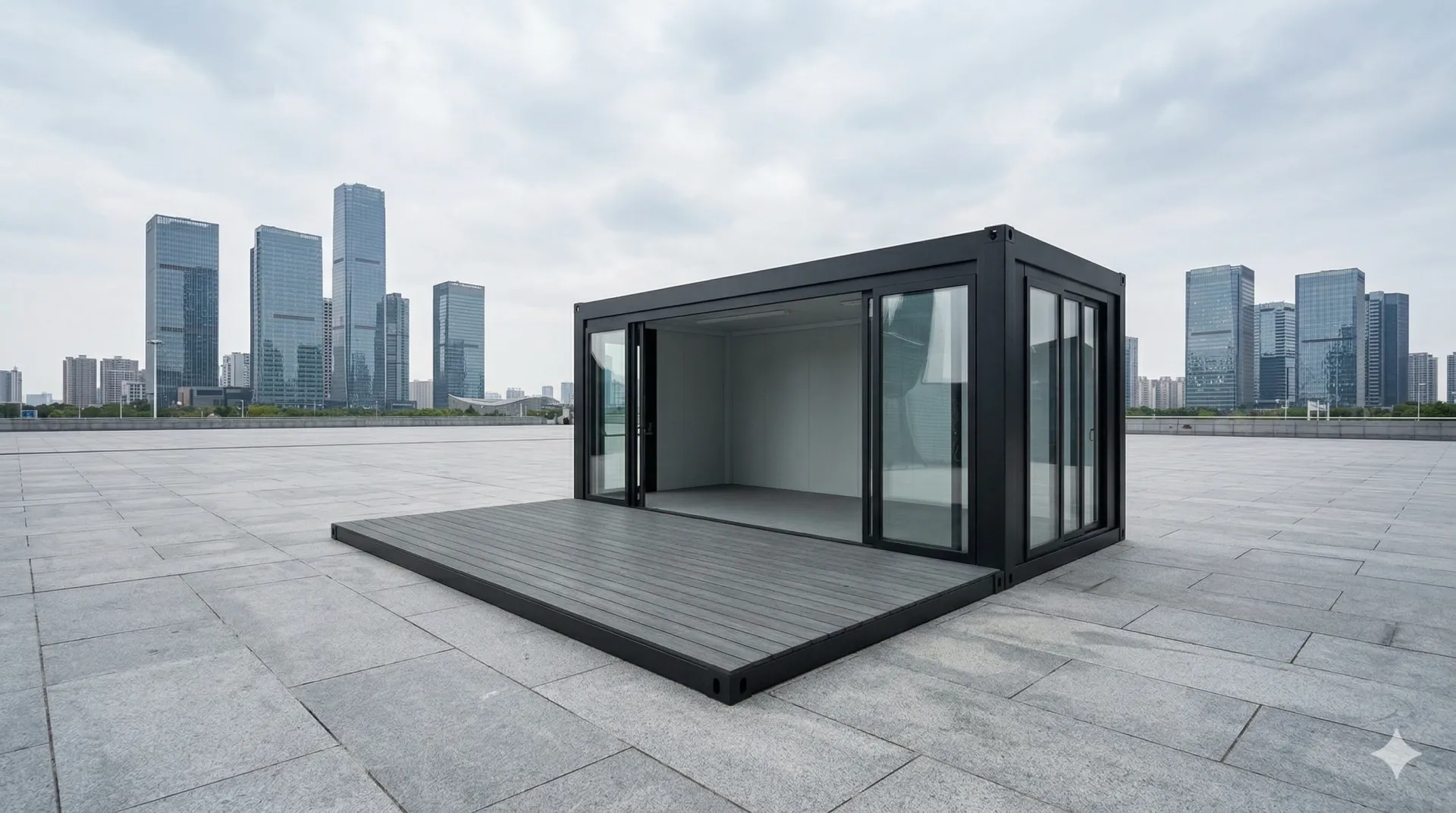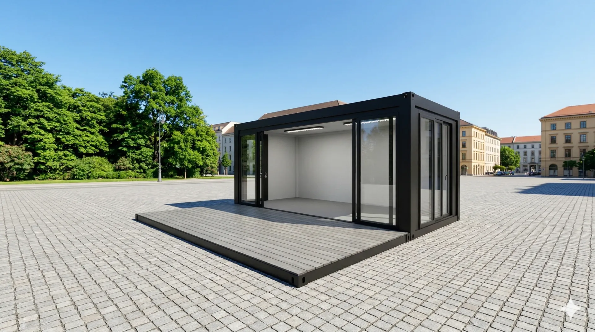 Der Eventcontainer Entwurf 11 definiert moderne Markeninszenierung neu. Durch seine großzügige Verglasung, die breite Schiebetür und die vorgesetzte Terrassenfläche schafft dieses Modul eine offene, einladende Atmosphäre, die Besucher direkt anspricht. Die robuste Stahlrahmenkonstruktion in Anthrazit kombiniert industrielle Beständigkeit mit einem minimalistischen Design, das sich nahtlos in jedes Event-Setting einfügt. Ob als exklusiver Pop-up-Store, mobiler Showroom oder hochwertiger Empfangsbereich – dieser Eventcontainer bietet maximale Sichtbarkeit und Funktionalität. Dank der vorinstallierten Beleuchtungseinheiten und der flexiblen Bodenfläche ist das Modul innerhalb kürzester Zeit einsatzbereit und garantiert einen professionellen Auftritt auf Messen, Roadshows oder Festivals.