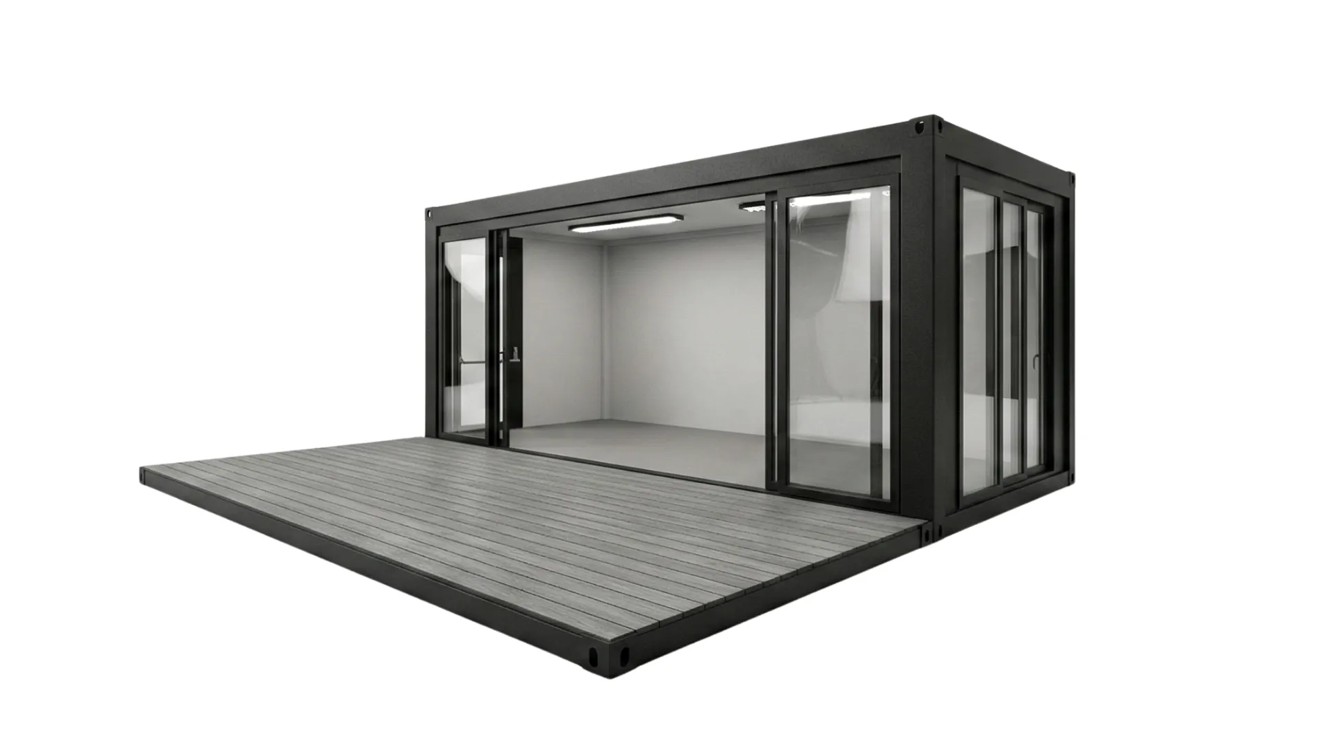 Integrierte Terrassenerweiterung: Die klappbare Bodenplattform verdoppelt die nutzbare Fläche im Außenbereich und schafft einen barrierefreien Übergang für Besucher.