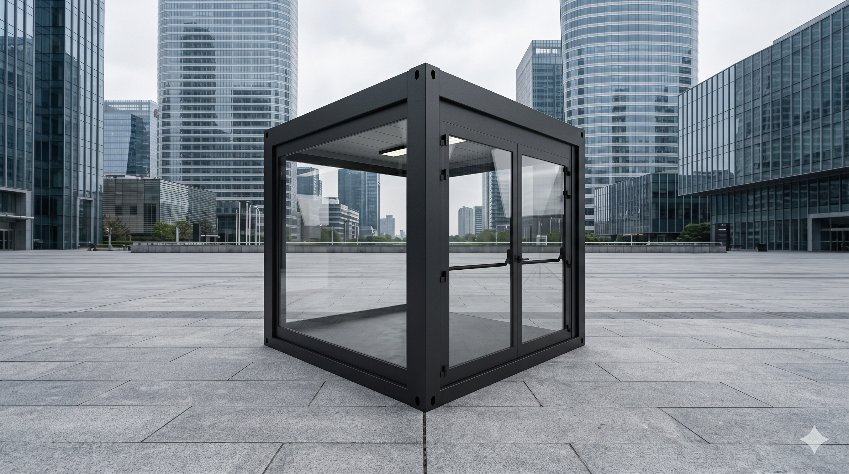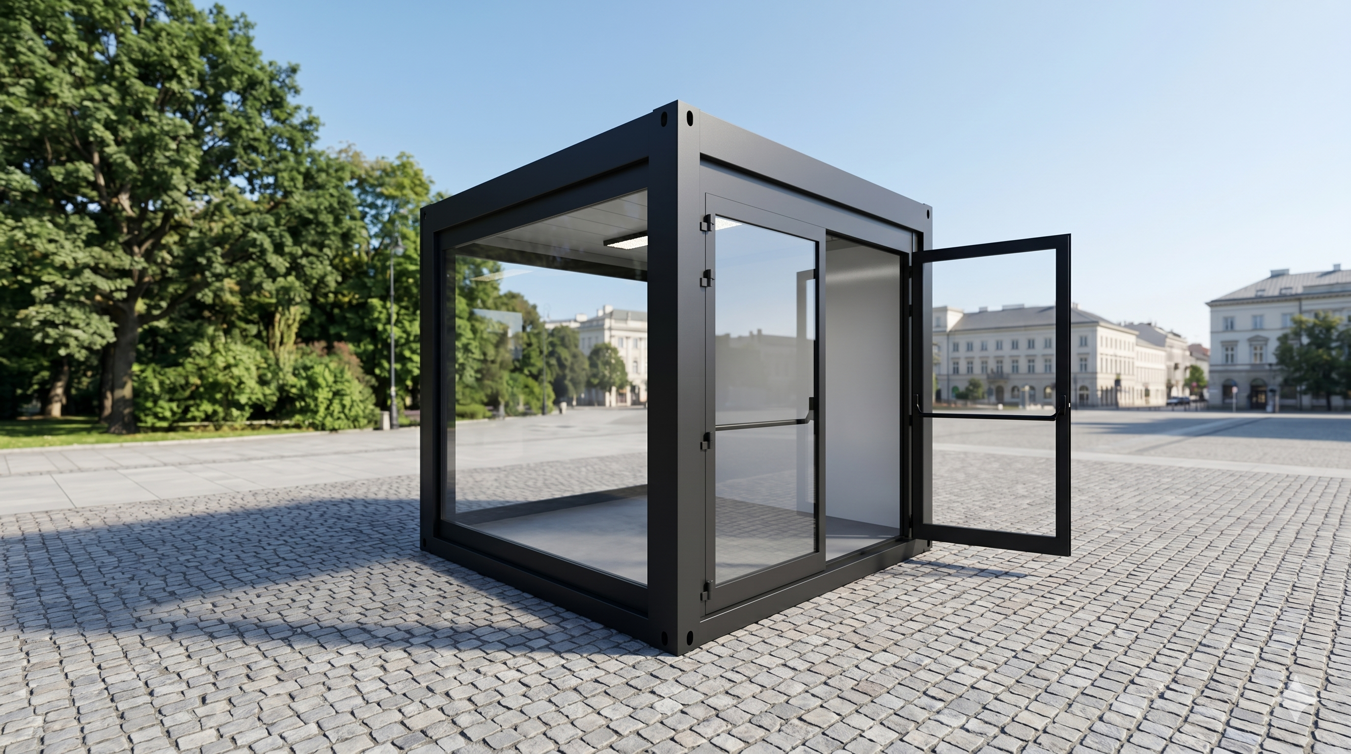 Der Eventcontainer Entwurf 12 ist ein kompakter vollverglaster Cube mit Doppelflügeltür. Durch seine einladende, lichtdurchflutete Atmosphäre zieht er alle Blicke auf sich und setzt Ihre Produkte perfekt in Szene. Die robuste Stahlrahmenkonstruktion in elegantem Anthrazit garantiert nicht nur höchste Standsicherheit, sondern verleiht jedem Event einen hochwertigen, industriellen Look. Ob als exklusive Werbefläche oder mobiler Showroom – dieser Container bietet die ideale Bühne für Ihre Marke. Ein funktionales Design-Statement, das Flexibilität und Ästhetik perfekt vereint.