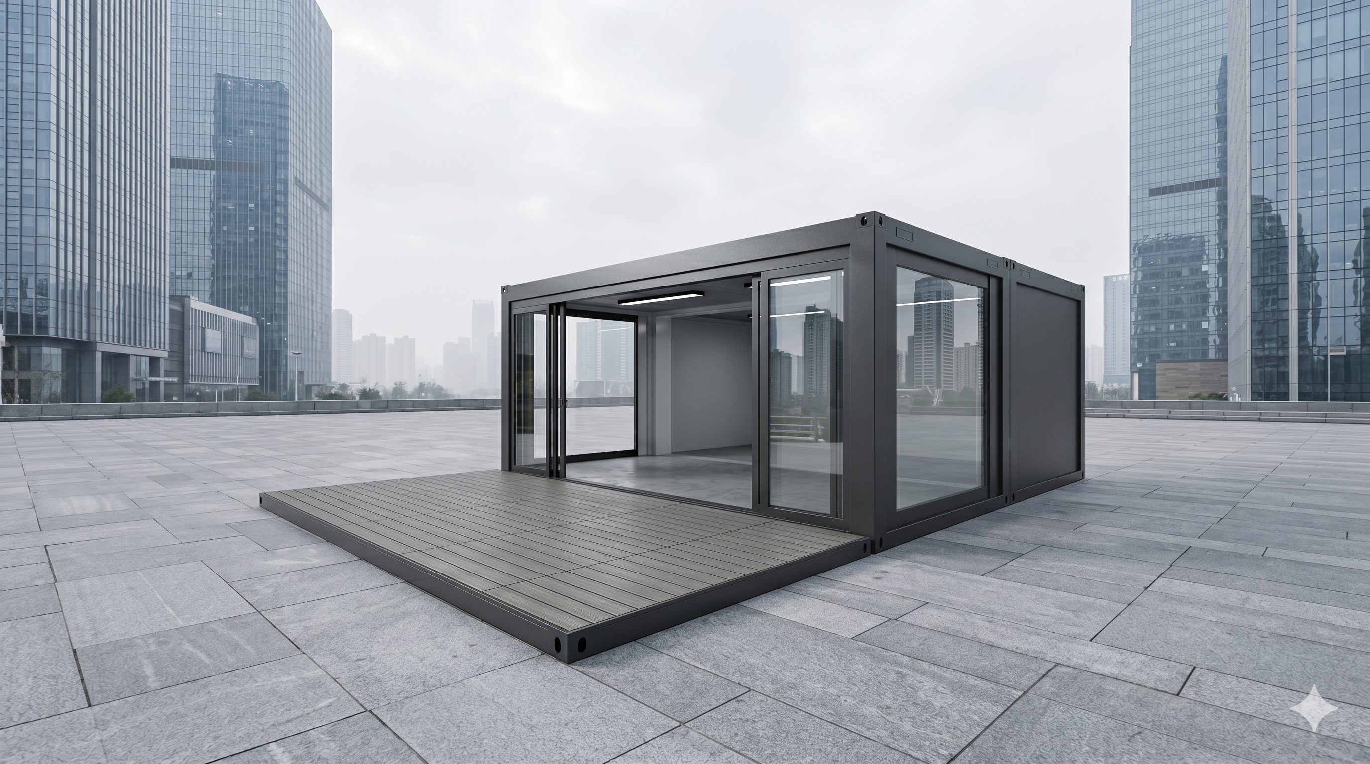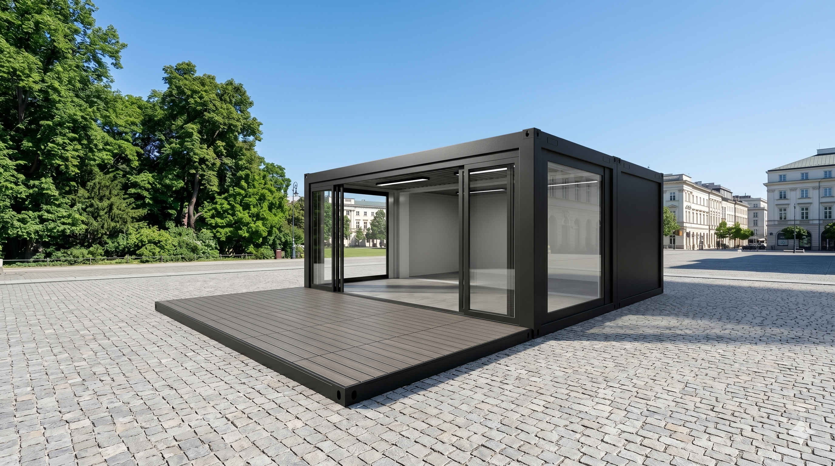 Der Eventcontainer Entwurf 122 definiert moderne Präsentationsflächen neu. Durch seine großzügigen Glasfronten und die vorgelagerte Terrasse schafft dieses Modul eine fließende Verbindung zwischen Innen- und Außenraum. Die robuste Stahlrahmenkonstruktion in Anthrazitoptik bietet nicht nur Stabilität, sondern auch ein zeitloses, industrielles Design, das sich jedem Branding anpasst. Ob als exklusiver Pop-up-Store, mobiler Showroom oder einladender Empfangsbereich auf Messen – dieser Container bietet die ideale Infrastruktur für hochwertige Markeninszenierungen. Dank der flexiblen Schiebetüren lässt sich der Luftstrom und Besucherfluss optimal steuern, während der helle Innenraum eine freundliche Atmosphäre für Beratungsgespräche schafft.