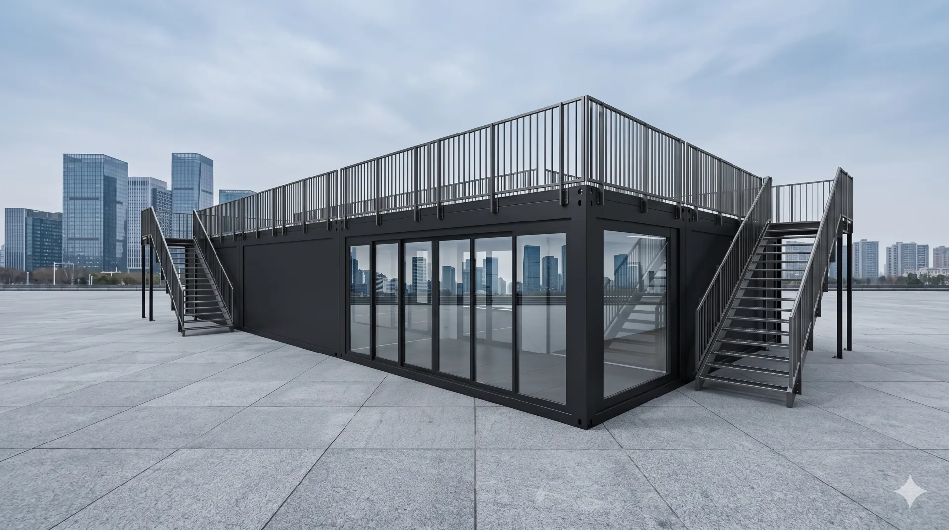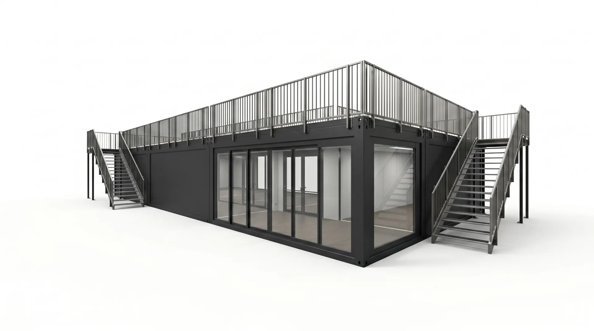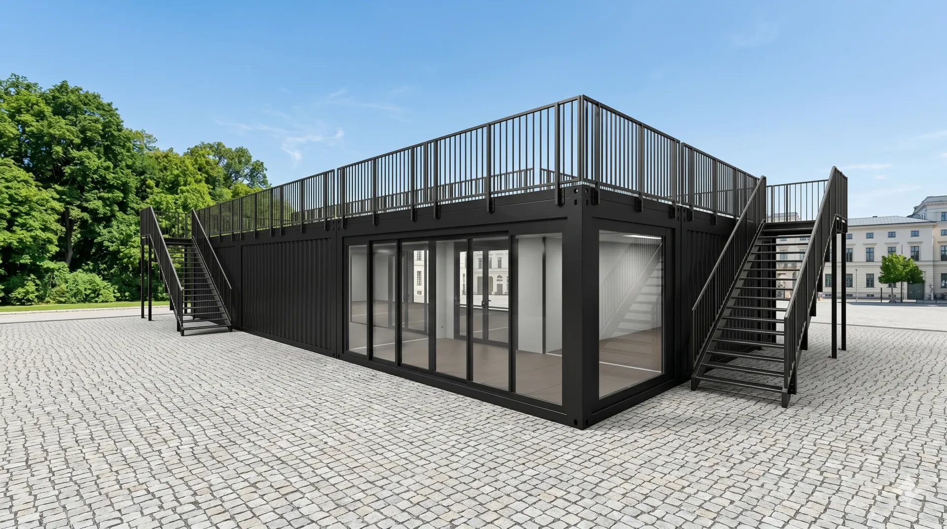 Der Eventcontainer Entwurf 33 besticht durch seine markante L-Form und eine weitläufige, begehbare Dachterrasse - ein Eventbau, der beeindruckt! Durch die Kombination aus geschlossenen Modulen und einer offenen Terrassenfläche bietet dieses Modell maximale Flexibilität für VIP-Bereiche, Pop-up-Stores oder repräsentative Empfangssituationen. Die großflächigen Glaselemente im Erdgeschoss sorgen für eine einladende Transparenz und fließende Übergänge zwischen Innen- und Außenraum. Dank der robusten Stahlrahmenkonstruktion ist der Container schnell einsatzbereit und bietet gleichzeitig ein modernes, industrielles Design, das sich jedem Markenauftritt nahtlos anpasst.