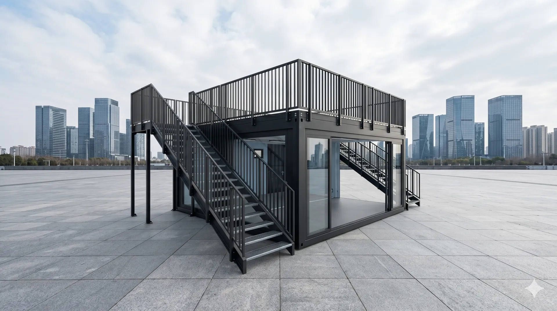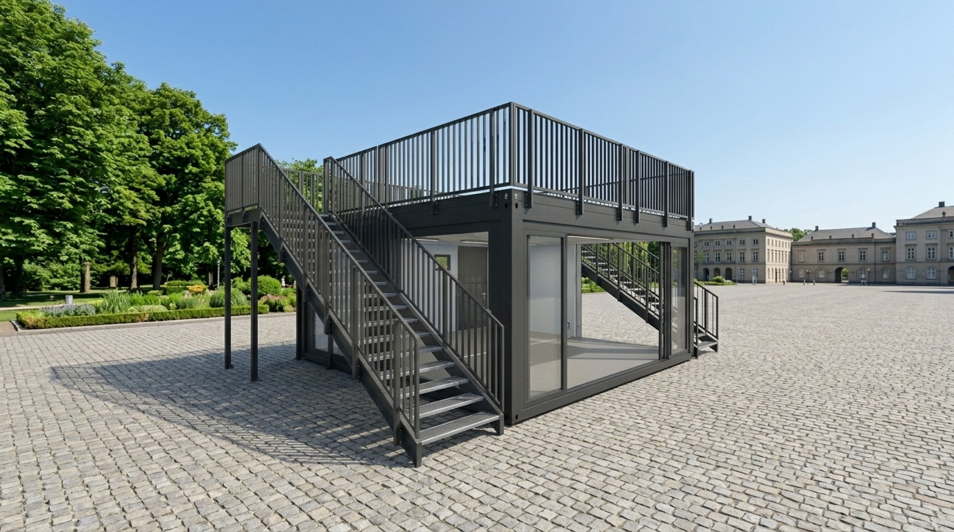Der Eventcontainer Entwurf 56 bietet eine beeindruckende Kombination aus funktionalem Innenraum und einer großzügigen Dachterrasse. Dieses Modul wurde speziell für Einsätze konzipiert, bei denen Sichtbarkeit und Exklusivität im Vordergrund stehen, wie beispielsweise auf Messen, Sportveranstaltungen oder als VIP-Lounge. Durch die großflächige Verglasung im Erdgeschoss entsteht eine helle, einladende Atmosphäre, während die über zwei separate Stahltreppen zugängliche Oberetage zusätzliche Kapazitäten für Gäste schafft. Die robuste Stahlrahmenkonstruktion garantiert höchste Stabilität und Sicherheit, selbst bei maximaler Auslastung der Aussichtsplattform.