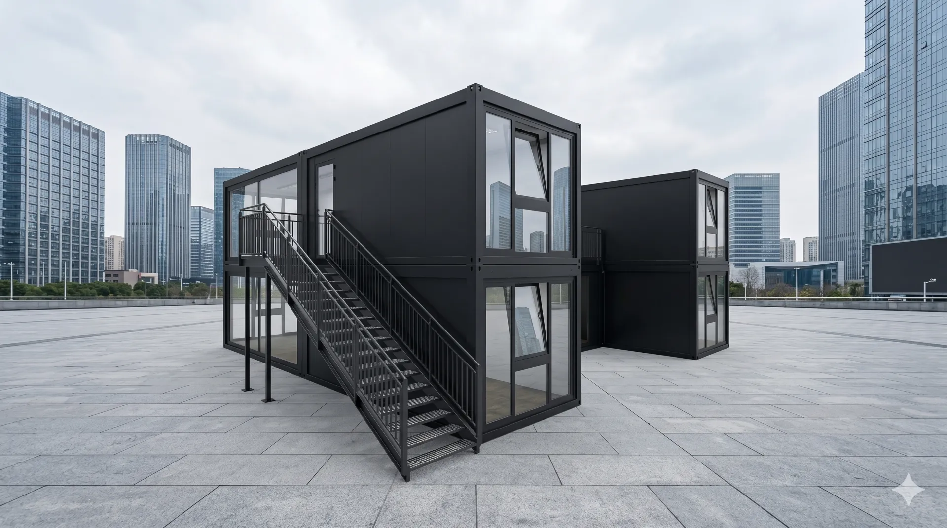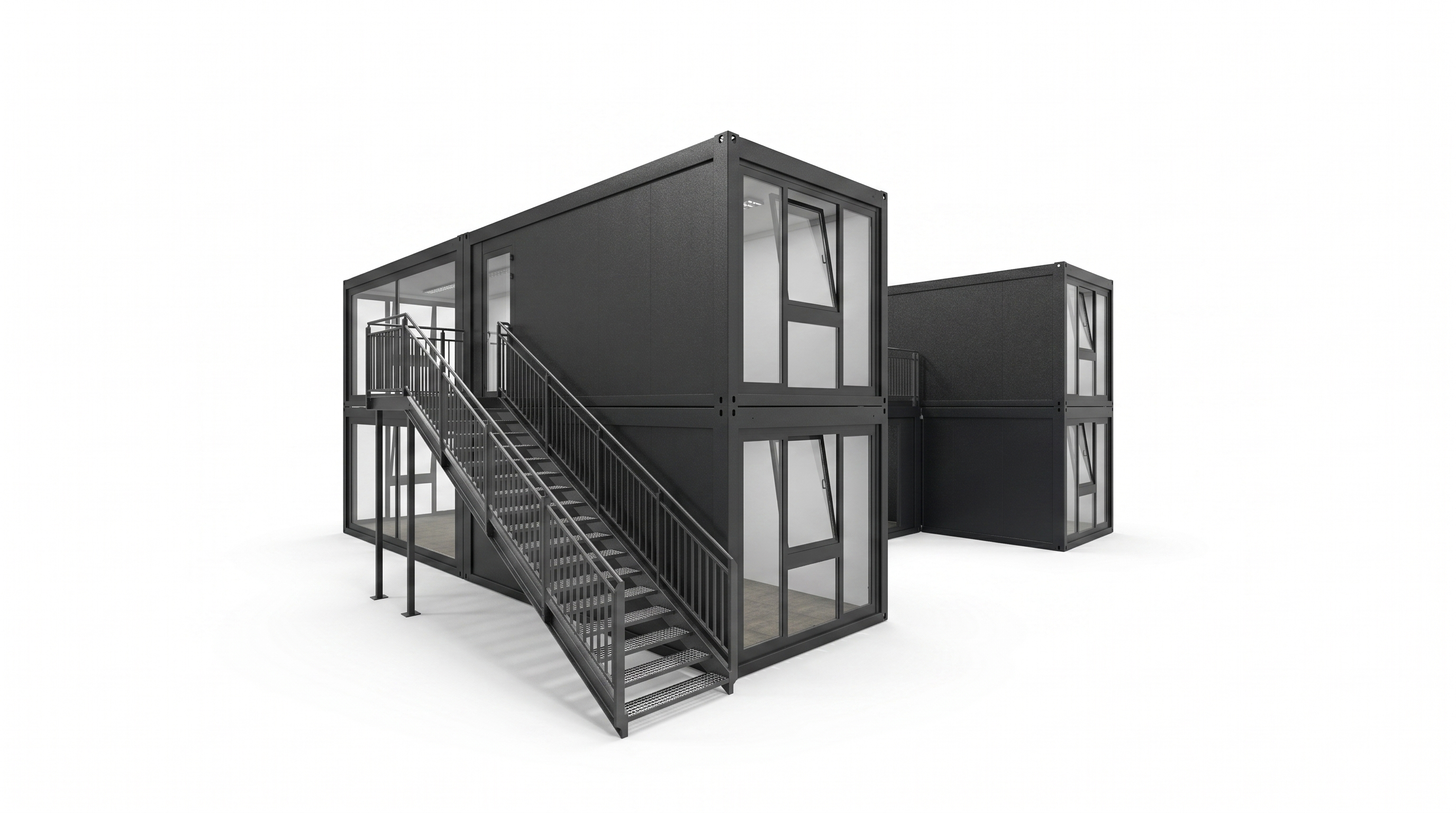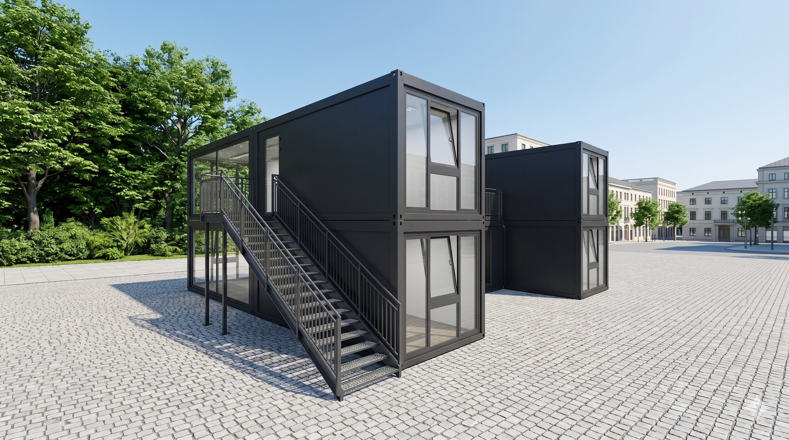 Wo Standardlösungen aufhören, fängt der Eventcontainer Entwurf 70 an. Dieses Modul bricht mit konventionellen Raumkonzepten, indem es eine vertikale Erlebniswelt schafft, die Dynamik und Professionalität ausstrahlt. Das Design zeichnet sich durch eine klare, geometrische Formsprache aus, die durch die markante Außentreppe einen industriellen und zugleich einladenden Charakter erhält. Dank der intelligenten Aufteilung in zwei autarke Ebenen lassen sich Public-Bereiche im Erdgeschoss und private Business-Lounges im Oberdeck räumlich perfekt trennen. Der Entwurf 70 ist somit nicht nur ein einfacher Container, sondern ein architektonisches Statement, das Markenkommunikation auf ein neues Level hebt und eine unverwechselbare Landmarke auf jedem Eventgelände setzt.