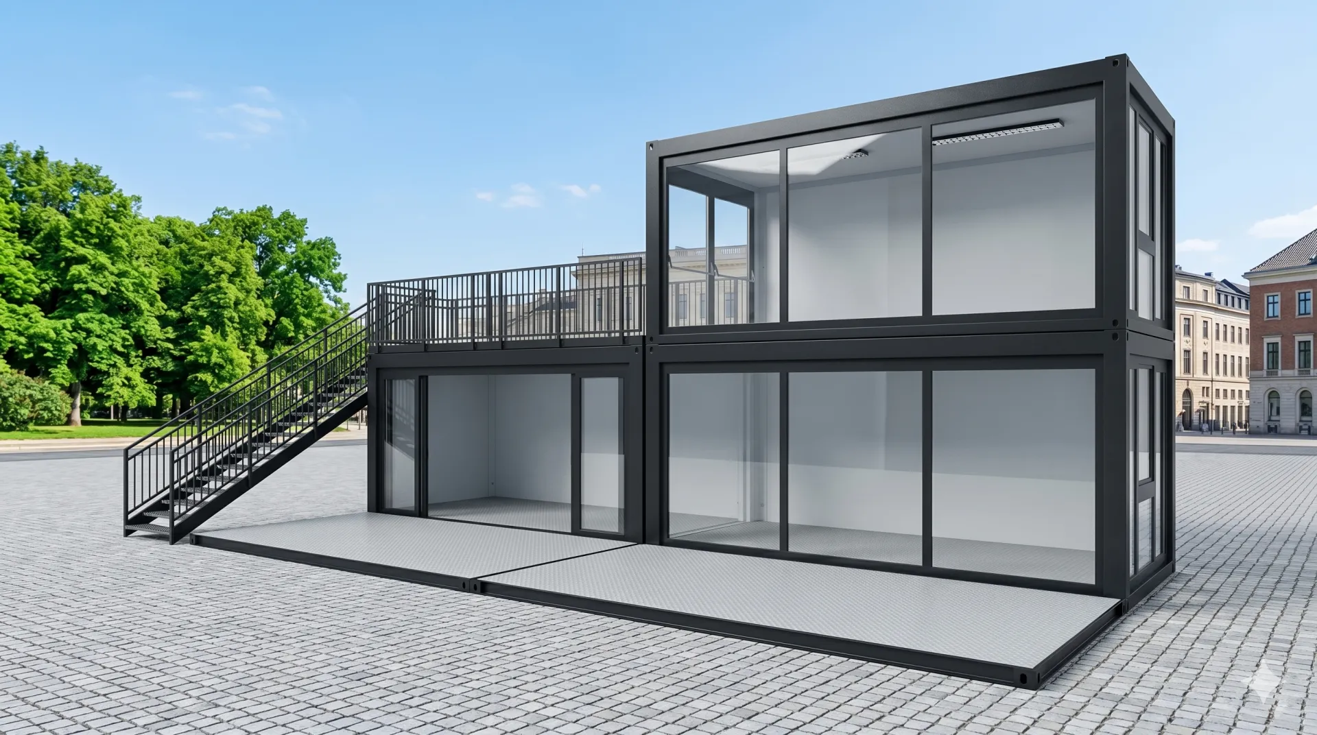 Der Eventcontainer Entwurf 72 ist die ideale Wahl für anspruchsvolle Markeninszenierungen, die auf zwei Ebenen beeindrucken wollen. Durch die intelligente Stapelung der Module entsteht eine repräsentative Gesamtfläche, die durch raumhohe Glaselemente eine außergewöhnliche Weite vermittelt. Das Erdgeschoss dient als offene Begegnungszone, während das Obergeschoss Rückzugsmöglichkeiten für vertrauliche Gespräche oder exklusive Präsentationen bietet. Die Dachterrasse wird über eine stabile Außentreppe erschlossen und schafft zusätzliche Interaktionsfläche im Freien. Dieser Eventcontainer kombiniert industrielles Design mit funktionaler Eleganz für Messen, Pop-up-Stores und Promotion-Aktionen.