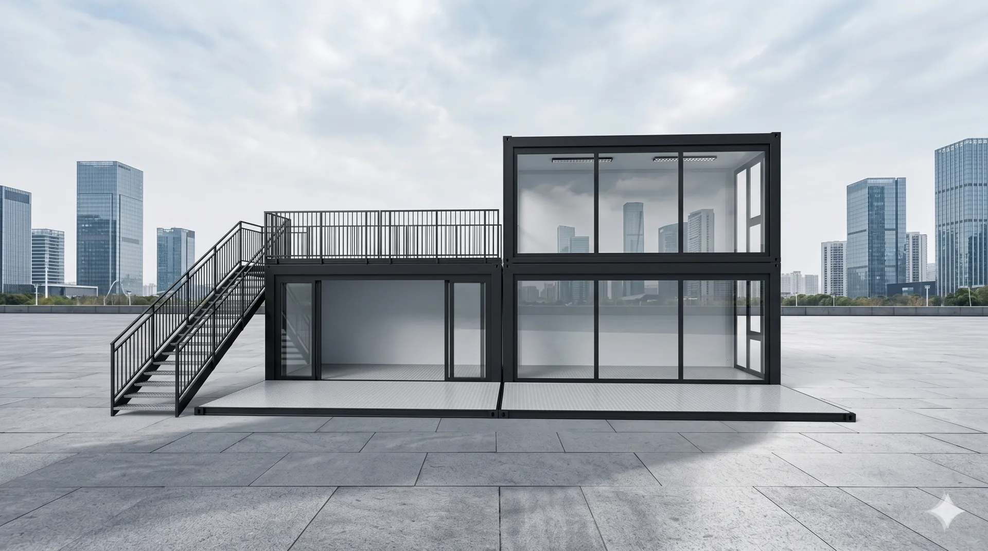 Modulare Treppenlösung: Die externe Stahltreppe ist platzsparend integriert und ermöglicht einen sicheren Zugang zur oberen Etage, ohne die Innenraumfläche zu beanspruchen.