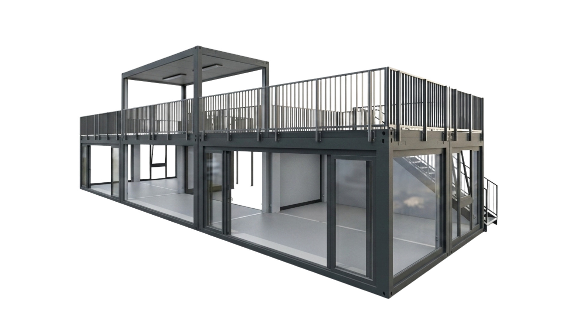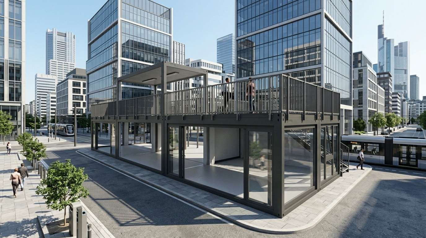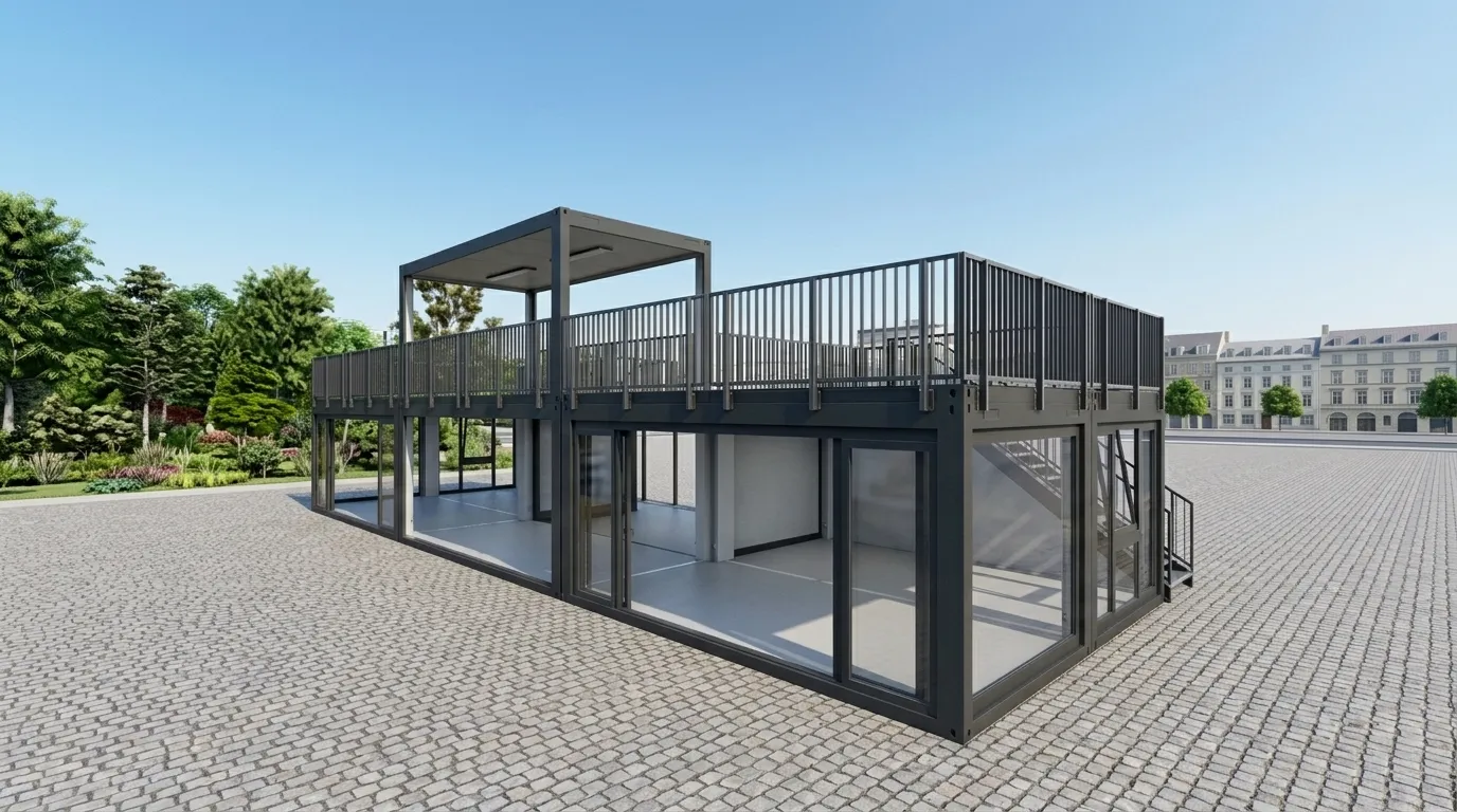 Der Eventcontainer Entwurf 79 definiert mobile Architektur neu und bietet auf zwei Ebenen maximale Flexibilität für Ihre Veranstaltungen. Durch die großflächige Verglasung im Erdgeschoss entstehen lichtdurchflutete Räume, die eine einladende Atmosphäre für Showrooms, VIP-Lounges oder Pop-up-Stores schaffen. Das Highlight dieses Moduls ist die weitläufige Dachterrasse, die über eine integrierte Außentreppe zugänglich ist und zusätzliche Fläche für Networking oder exklusives Catering bietet. Dank der robusten Rahmenkonstruktion und des modularen Aufbaus lässt sich dieser Eventcontainer effizient transportieren und vor Ort schnell einsatzbereit machen – ideal für Messen, Festivals und Roadshows.
