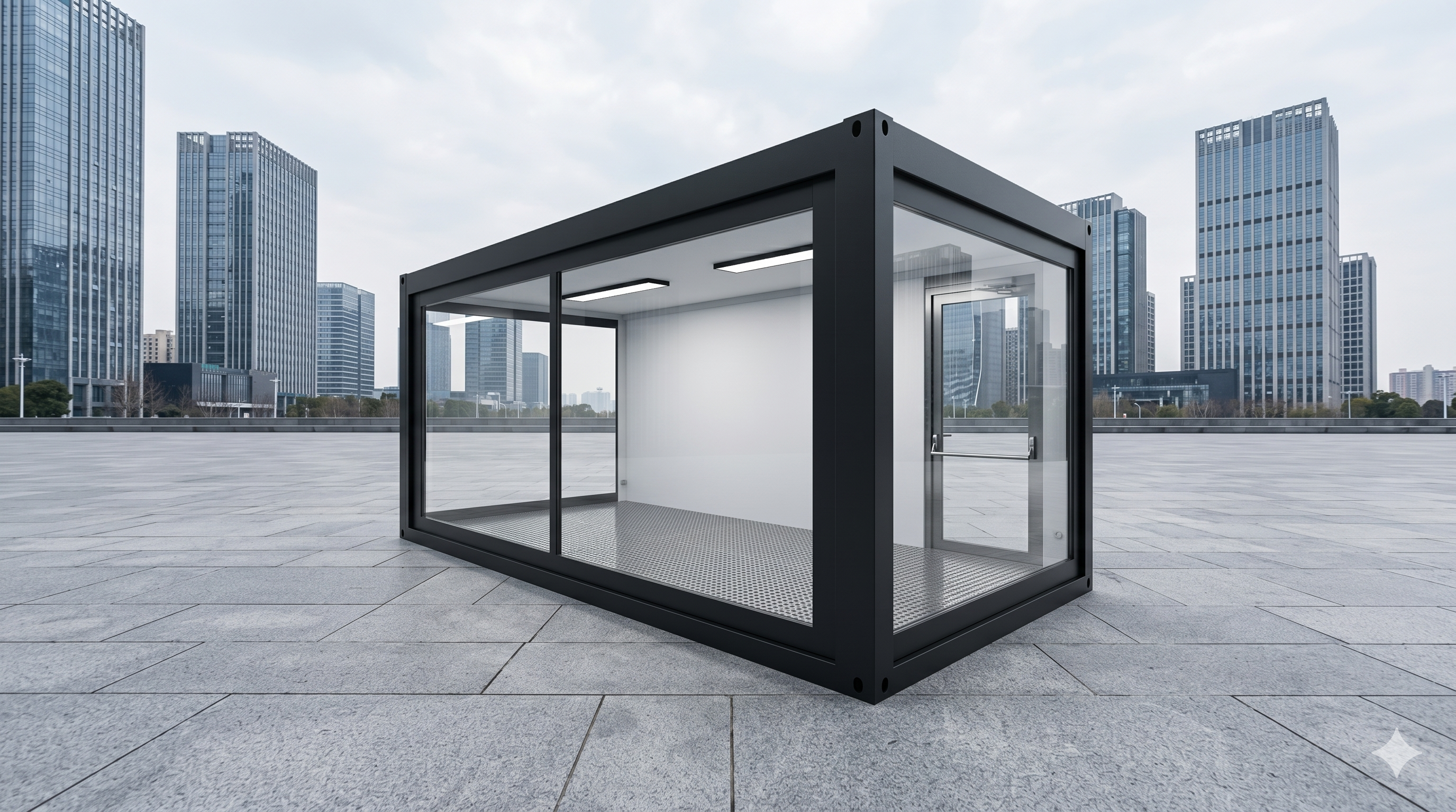 Hochwertiges Finish: Trotz seiner Mobilität bietet das Modul durch die präzise Verarbeitung und die edle Anthrazit-Optik eine ästhetische Wertigkeit, die deutlich über Standard-Containern liegt.