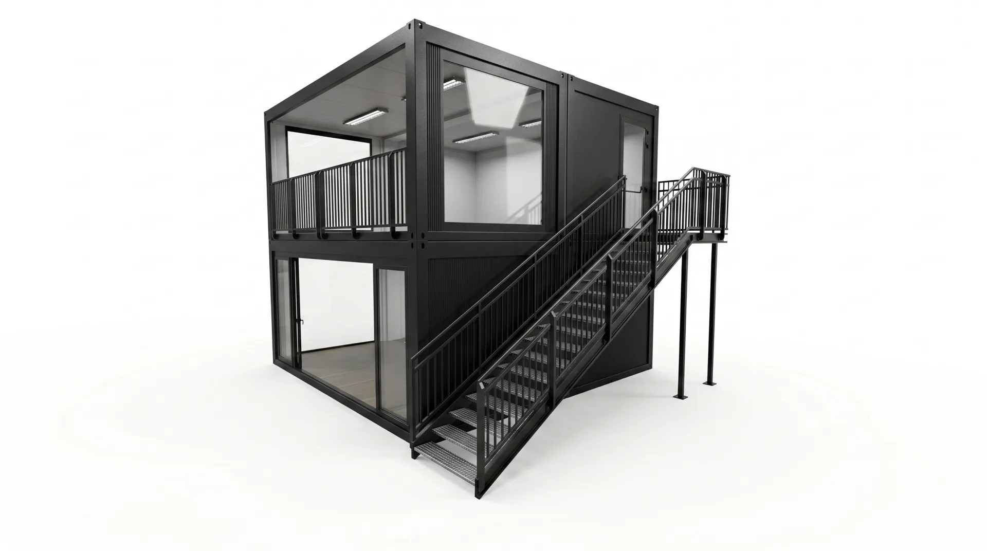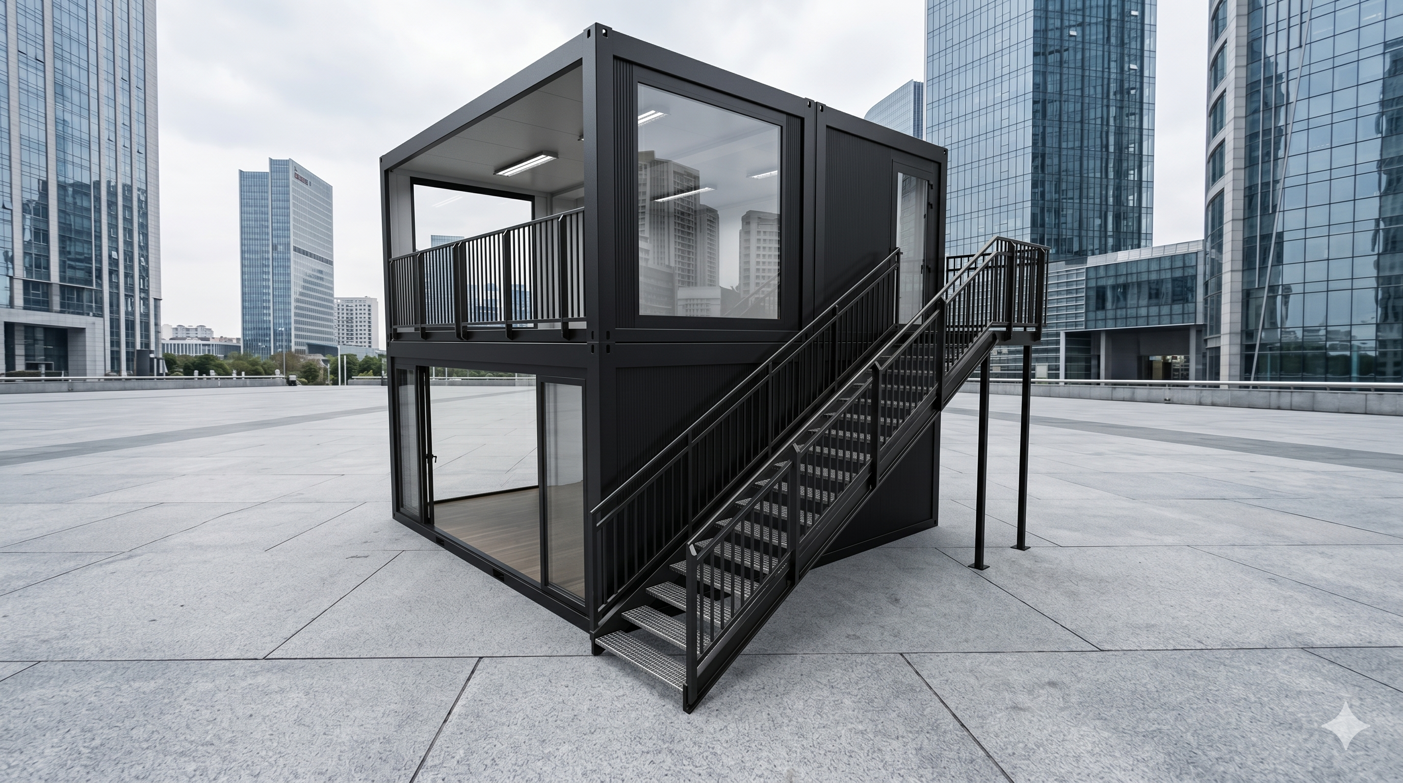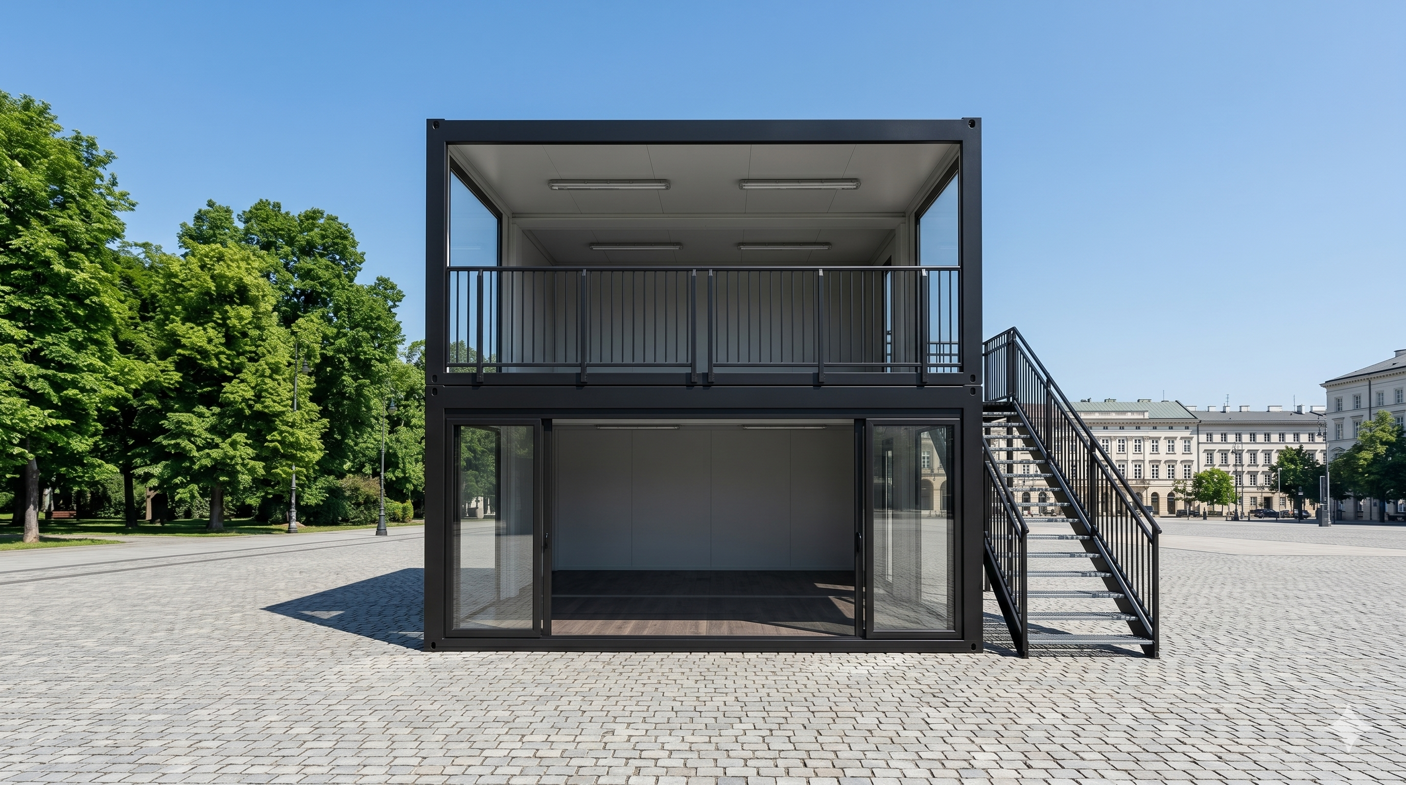 Der Eventcontainer Entwurf 99 definiert moderne Event-Infrastruktur neu, indem er auf zwei Etagen maximale Präsenz und Funktionalität vereint. Durch die großzügigen Glasfronten im Erd- und Obergeschoss entsteht eine helle, einladende Atmosphäre, die sich ideal für VIP-Lounges, mobile Showrooms oder repräsentative Messestände eignet. Eine Außentreppe führt ins Obergeschoss, das Ihren Gästen einen exklusiven Ausblick bietet. Dank der robusten Stahlrahmenkonstruktion in elegantem Schwarz fügt sich dieses Modul nahtlos in hochwertige Veranstaltungskonzepte ein. Dieser Eventcontainer bietet die perfekte Kombination aus industriellem Charme und modernem Komfort für anspruchsvolle Markenauftritte.