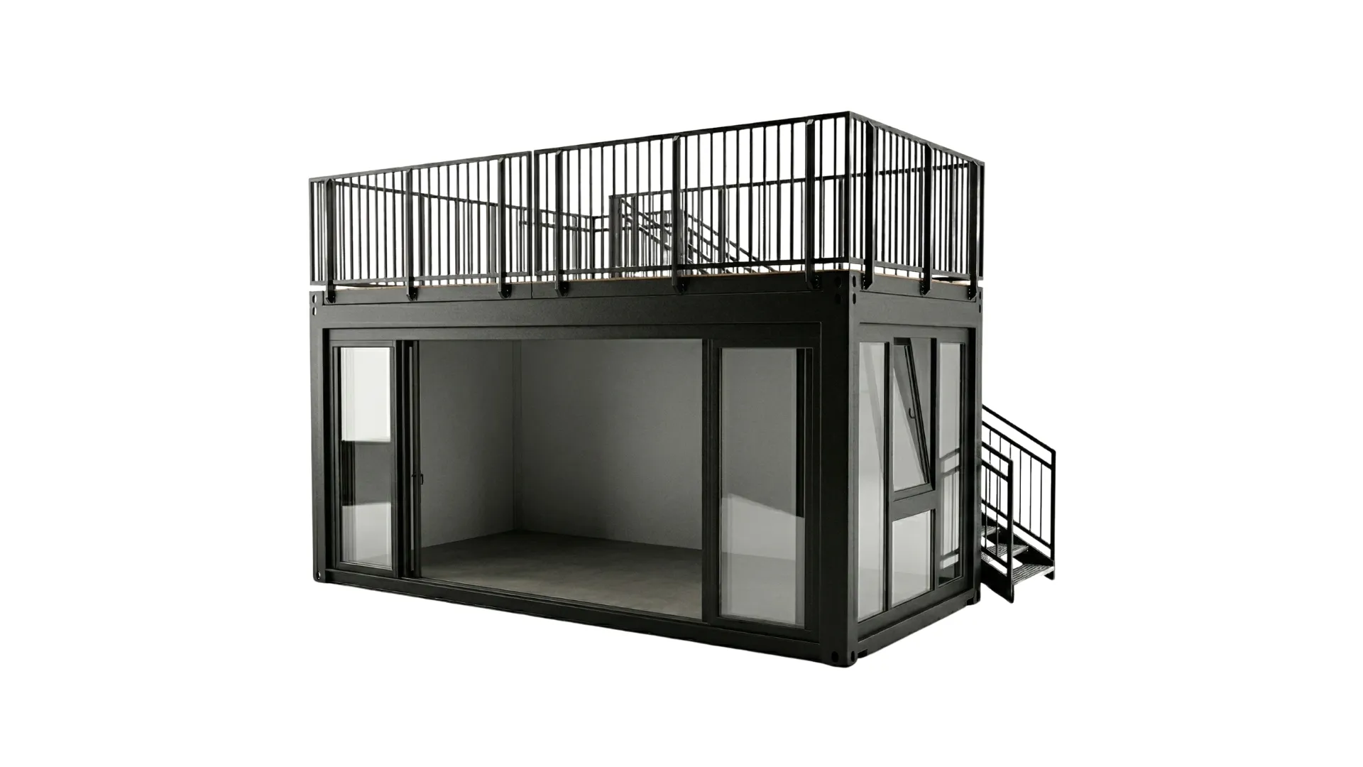 Dachterrasse & Außenbereich: Ein vollständig begehbares Oberdeck inklusive Treppenaufgang und Geländer schafft wertvolle Zusatzfläche für Lounge-Bereiche oder Networking-Events.