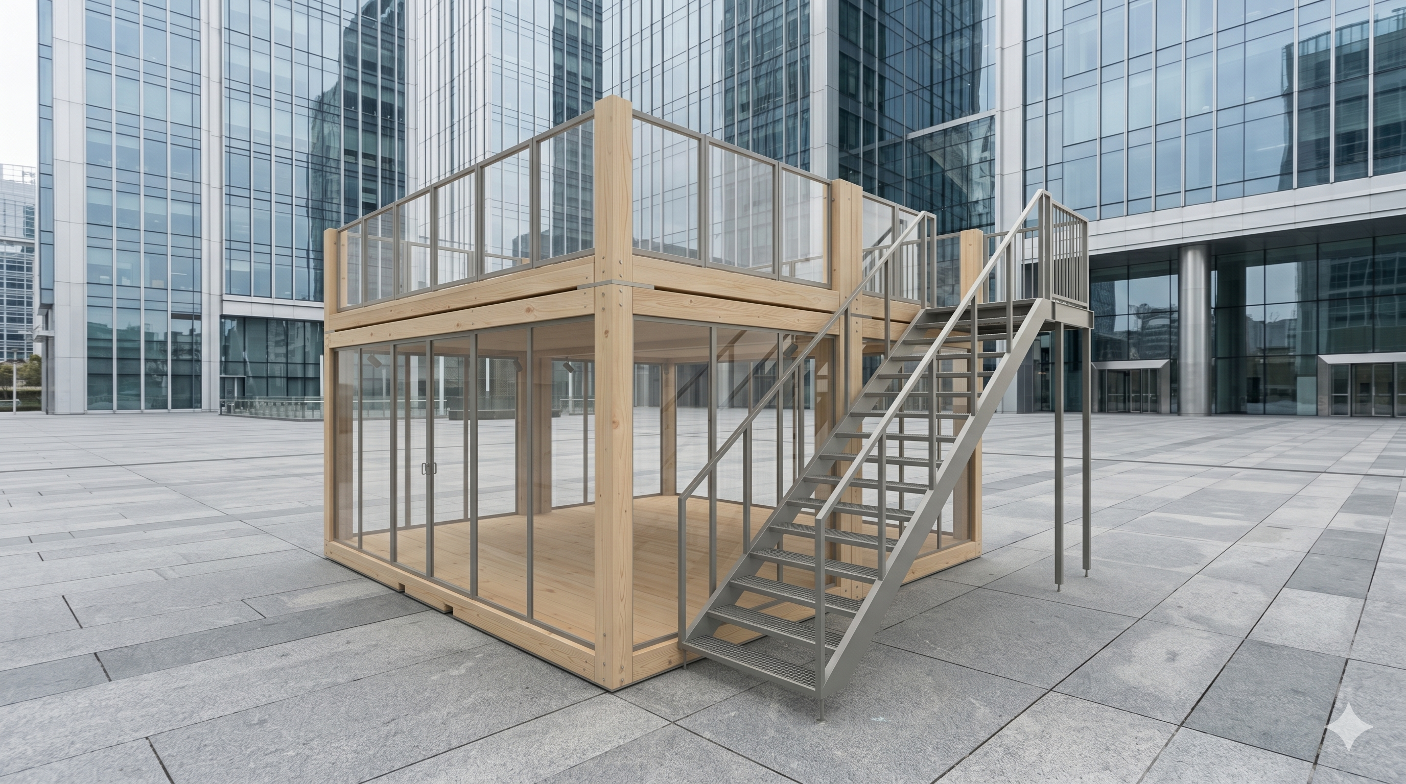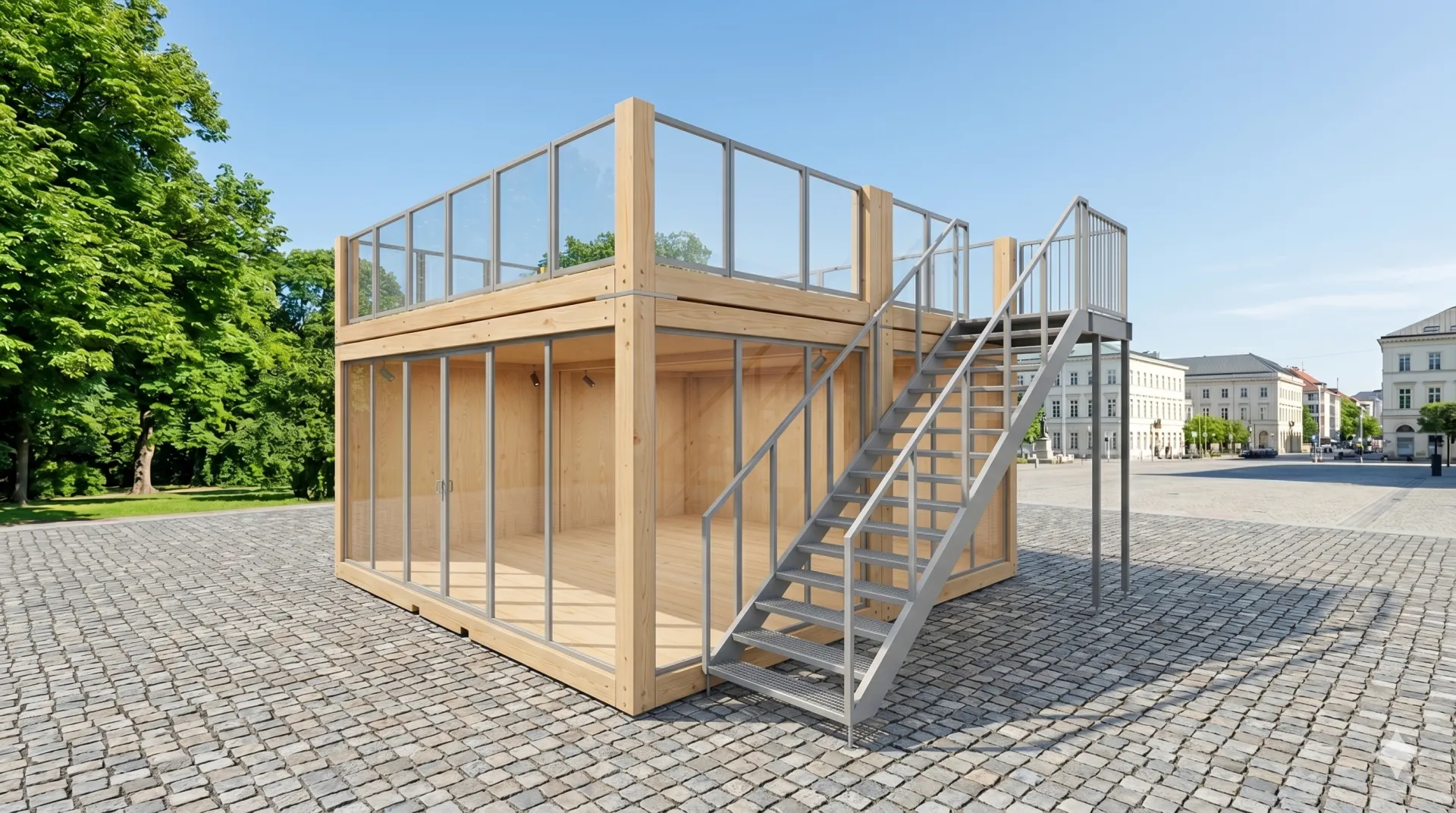 Der Woodline Entwurf 201 ist ein zweistöckiger Eventcontainer in Holzbauweise, der speziell für den Einsatz auf Events entwickelt wurde. Das Modul besteht aus einer robusten Massivholz-Konstruktion, die im Erdgeschoss mit großflächigen Glaselementen kombiniert ist. Über eine externe Stahltreppe gelangt man auf die obere Ebene, die als vollflächig nutzbare Dachterrasse mit umlaufendem Geländer ausgeführt ist. Durch den Verzicht auf tragende Innenwände lässt sich das Erdgeschoss flexibel einrichten – etwa als Verkaufsraum, Informationsstand oder Besprechungsraum. Die Kombination aus Holz und Glas sorgt für eine natürliche Optik und bietet gleichzeitig eine klare Sichtbarkeit der Innenflächen.