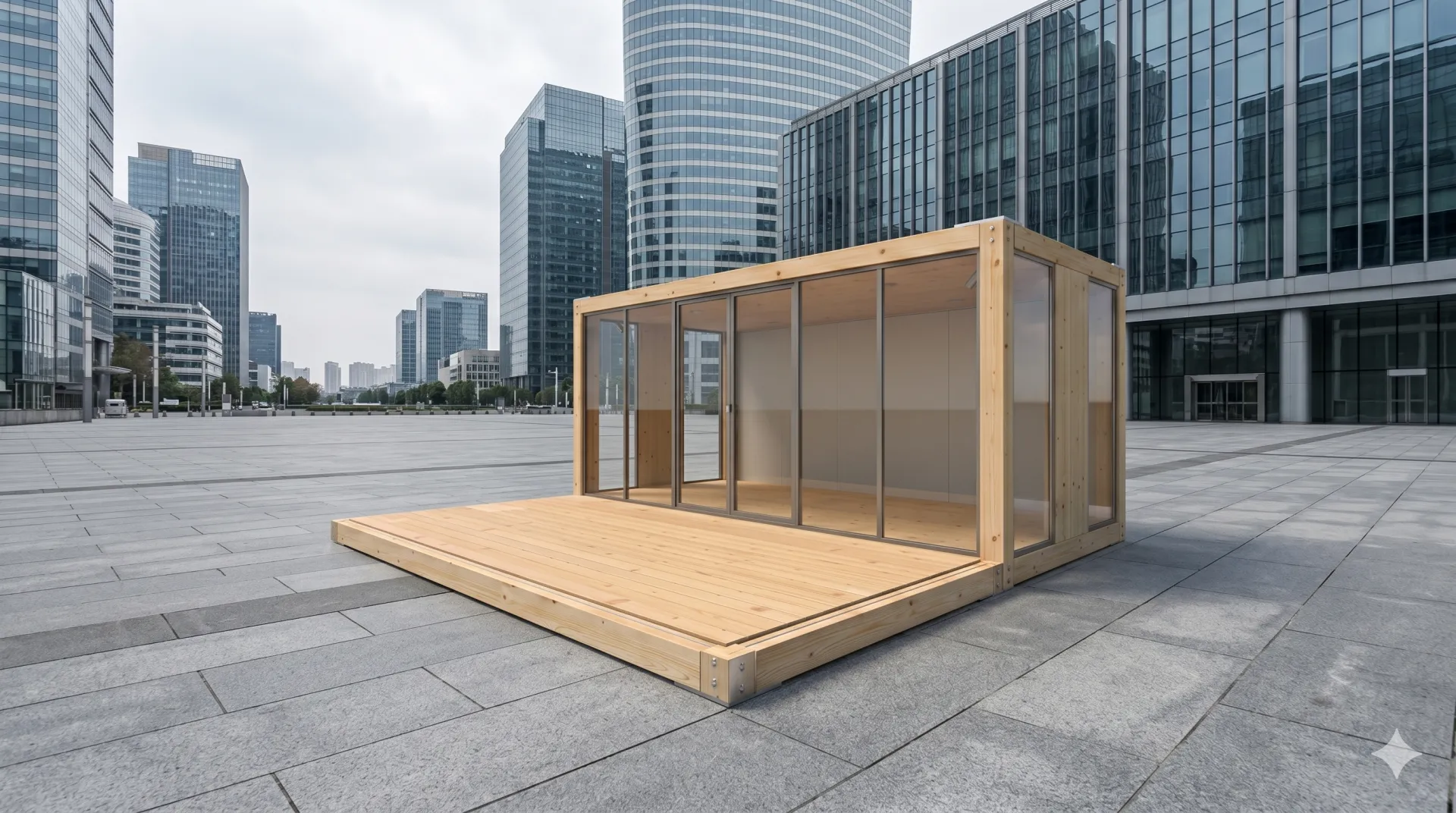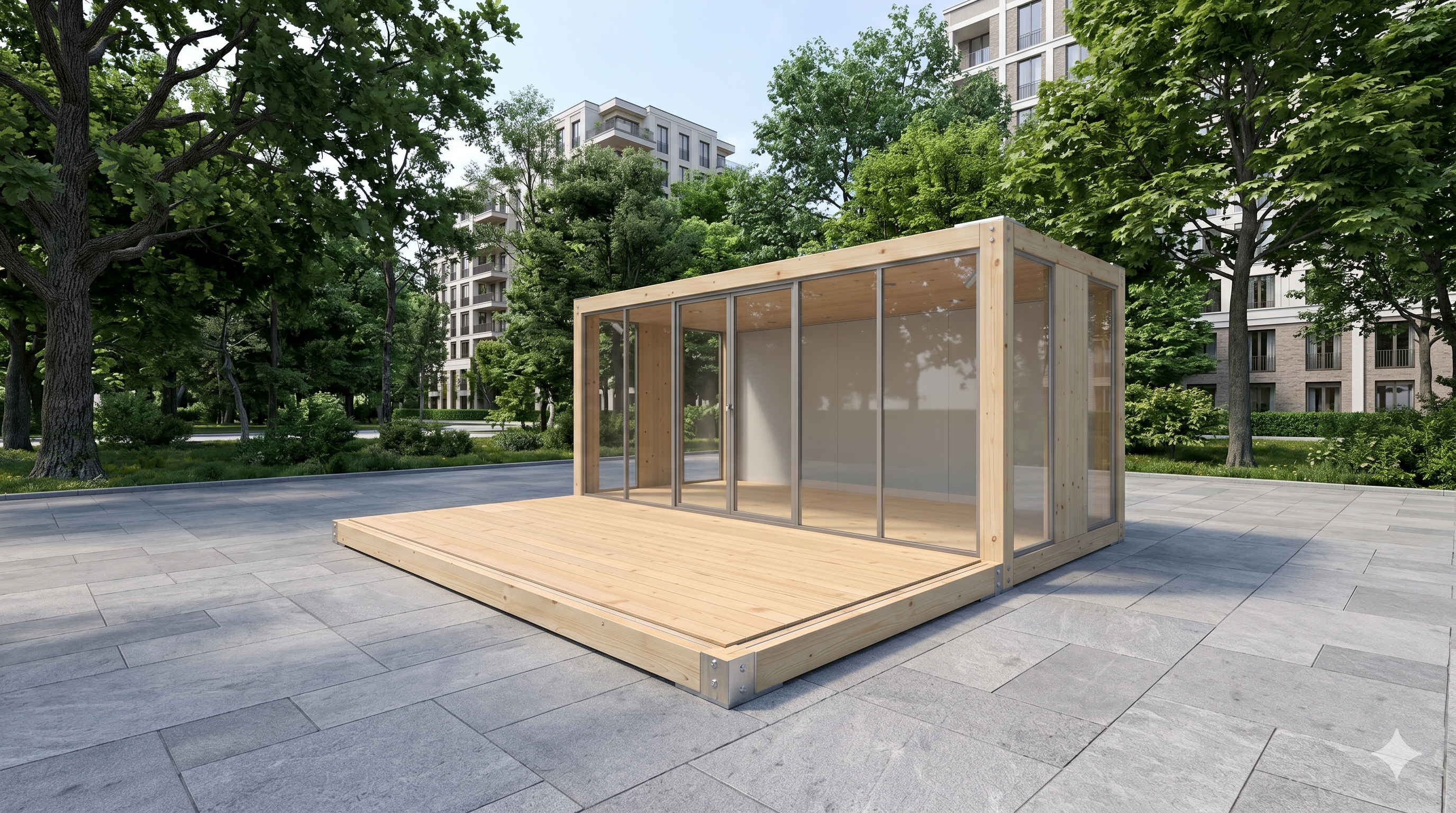 Der Woodline Entwurf 206 überzeugt durch eine Symbiose aus nachhaltigem Echtholz-Design und maximaler Transparenz. Die markante Konstruktion aus hochwertigen Brettschichtholz-Elementen verleiht jedem Einsatzort eine warme, einladende Atmosphäre, die sich deutlich von industriellen Standardlösungen abhebt. Großzügige, bodentiefe Glasfronten über die gesamte Längs- und Stirnseite sorgen für lichtdurchflutete Innenräume und eine nahtlose Verbindung zwischen Interieur und Außenbereich. Dank der integrierten, weitläufigen Terrassenfläche bietet dieses Modul eine repräsentative Plattform für anspruchsvolle Projekte. Ob als exklusiver Empfangsbereich, hochwertiger Showroom oder Rückzugsort – das Woodline-Modul vereint ökologische Materialwahl mit moderner Architektur für höchste Ansprüche.