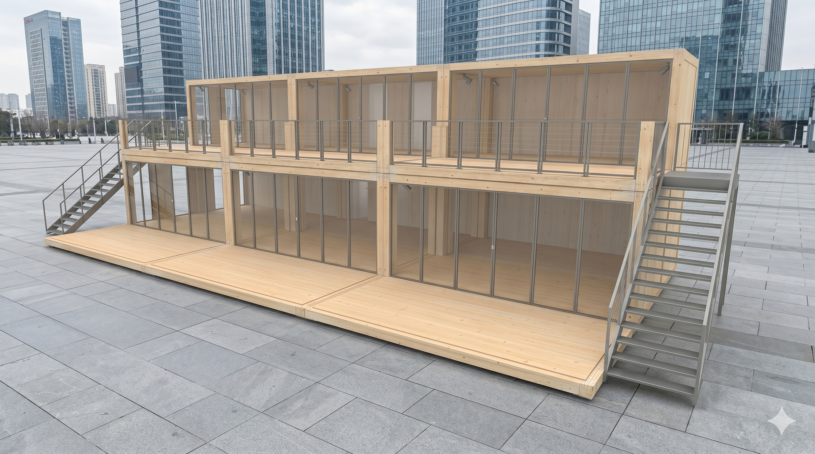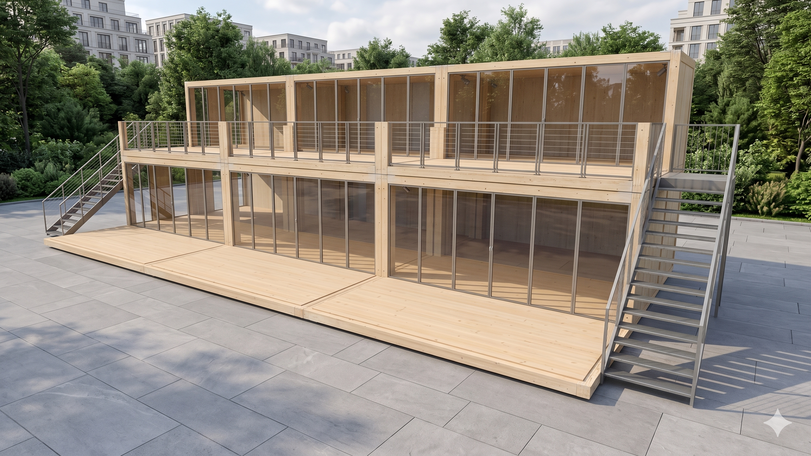 Das Holzmodul Woodline Entwurf 210 ist eine durchdachte Raumlösung, die durch ihre klare Linienführung und eine effiziente Zweigeschossigkeit überzeugt. Die Konstruktion basiert auf einem stabilen Holzrahmenbau, der durch großzügige Glasfassaden auf beiden Ebenen ergänzt wird. Das Erdgeschoss bietet eine ebenerdige, offene Fläche für vielfältige Nutzungen, während das Obergeschoss über zwei separate Außentreppen erschlossen wird. Ein wesentliches Merkmal dieses Entwurfs ist die integrierte Dachterrasse, die zusätzliche Nutzfläche im Freien schafft und eine erhöhte Perspektive auf die Umgebung ermöglicht. Durch die Kombination aus natürlichen Materialien und einer transparenten Bauweise lässt sich dieses Holzmodul nahtlos in unterschiedliche Umgebungen integrieren und bietet eine hochwertige Alternative zu Standard-Modulbauten.