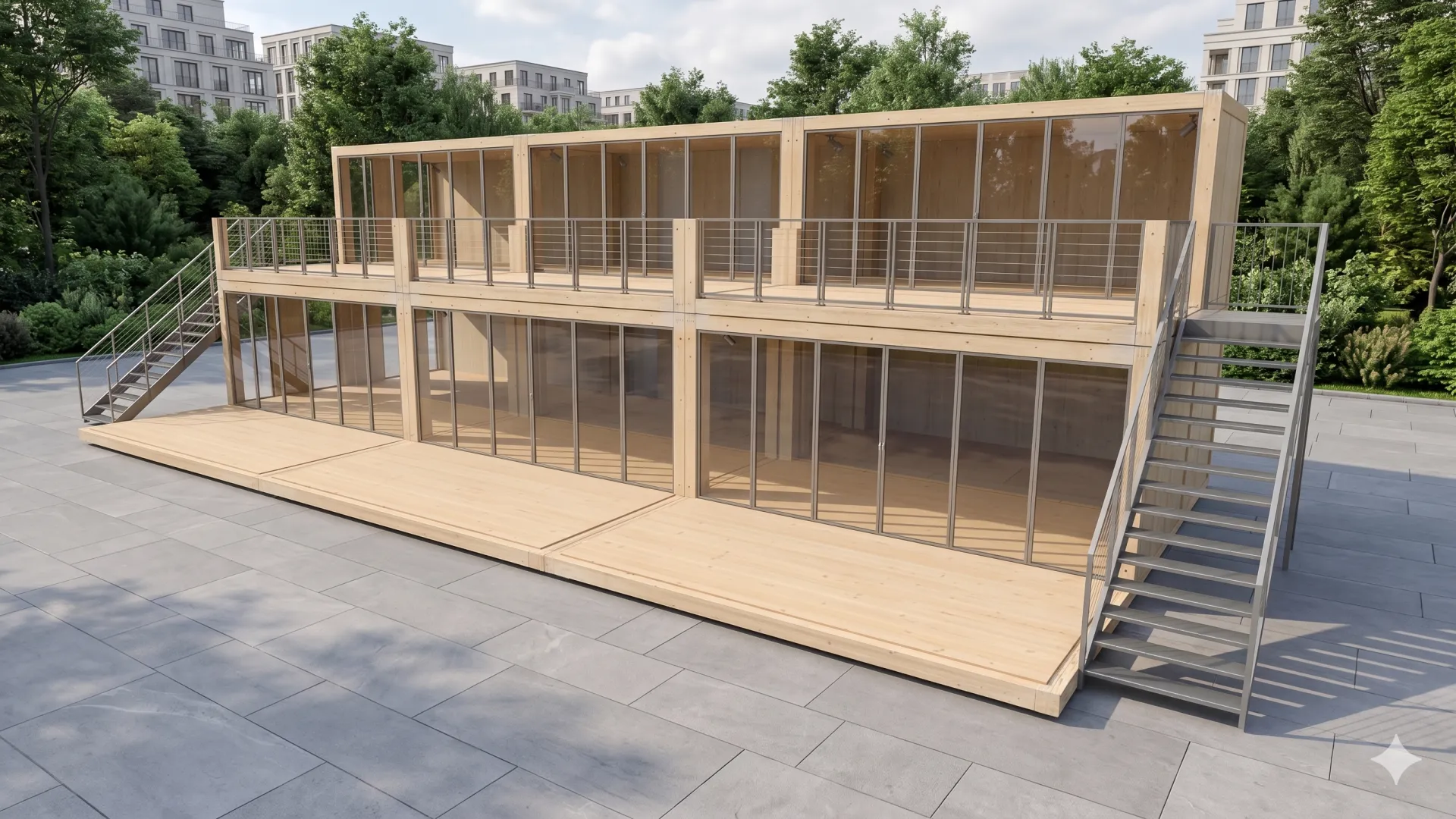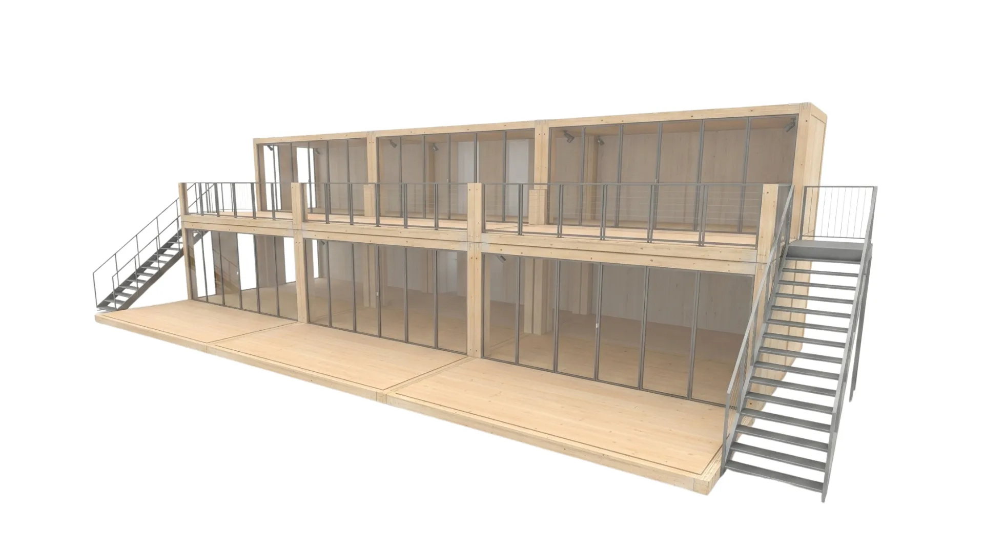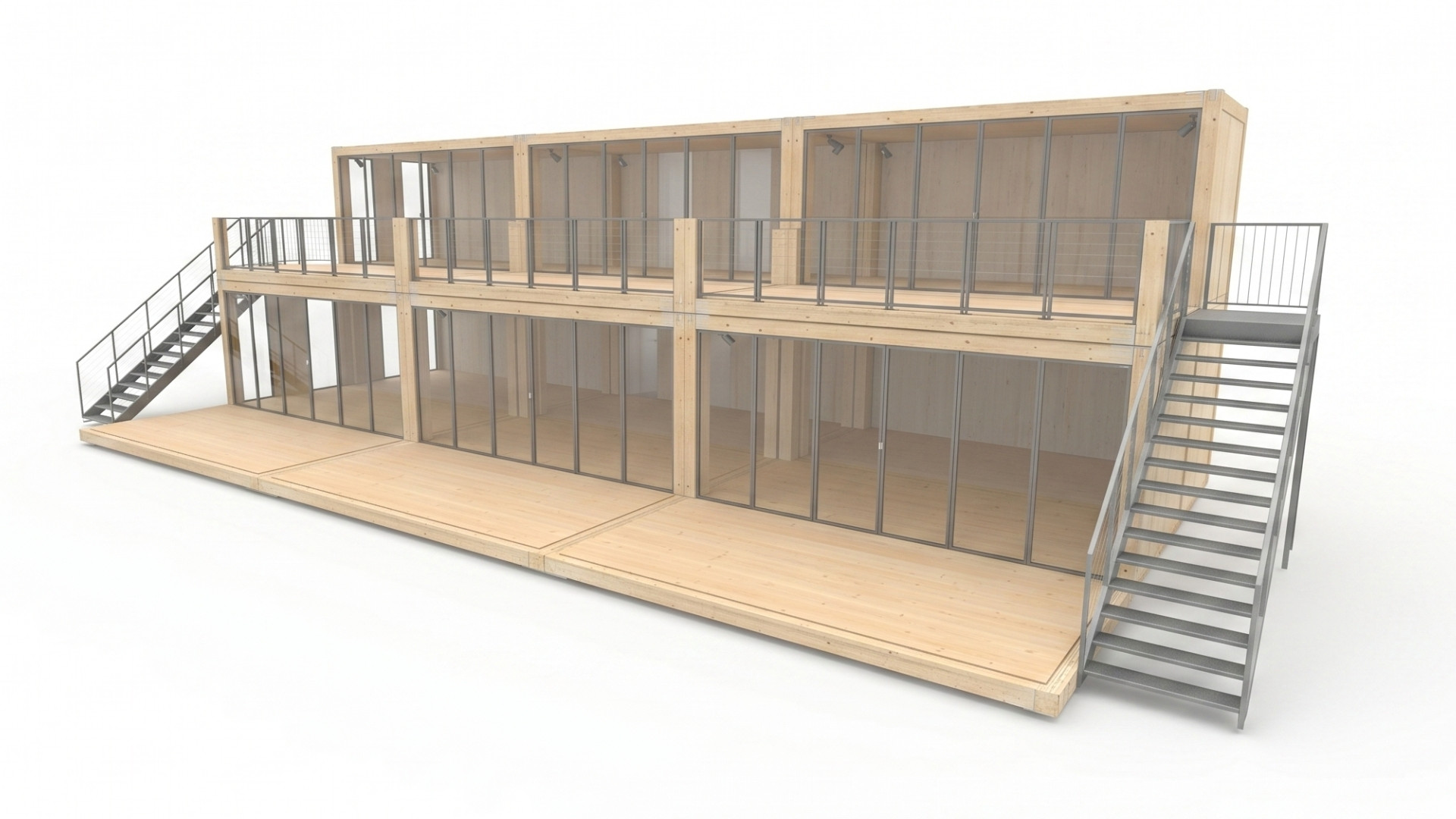 Großflächige Verglasung: Die bodentiefen Glaselemente an den Längsseiten des Moduls sorgen für eine natürliche Belichtung beider Etagen und schaffen eine offene Raumatmosphäre.