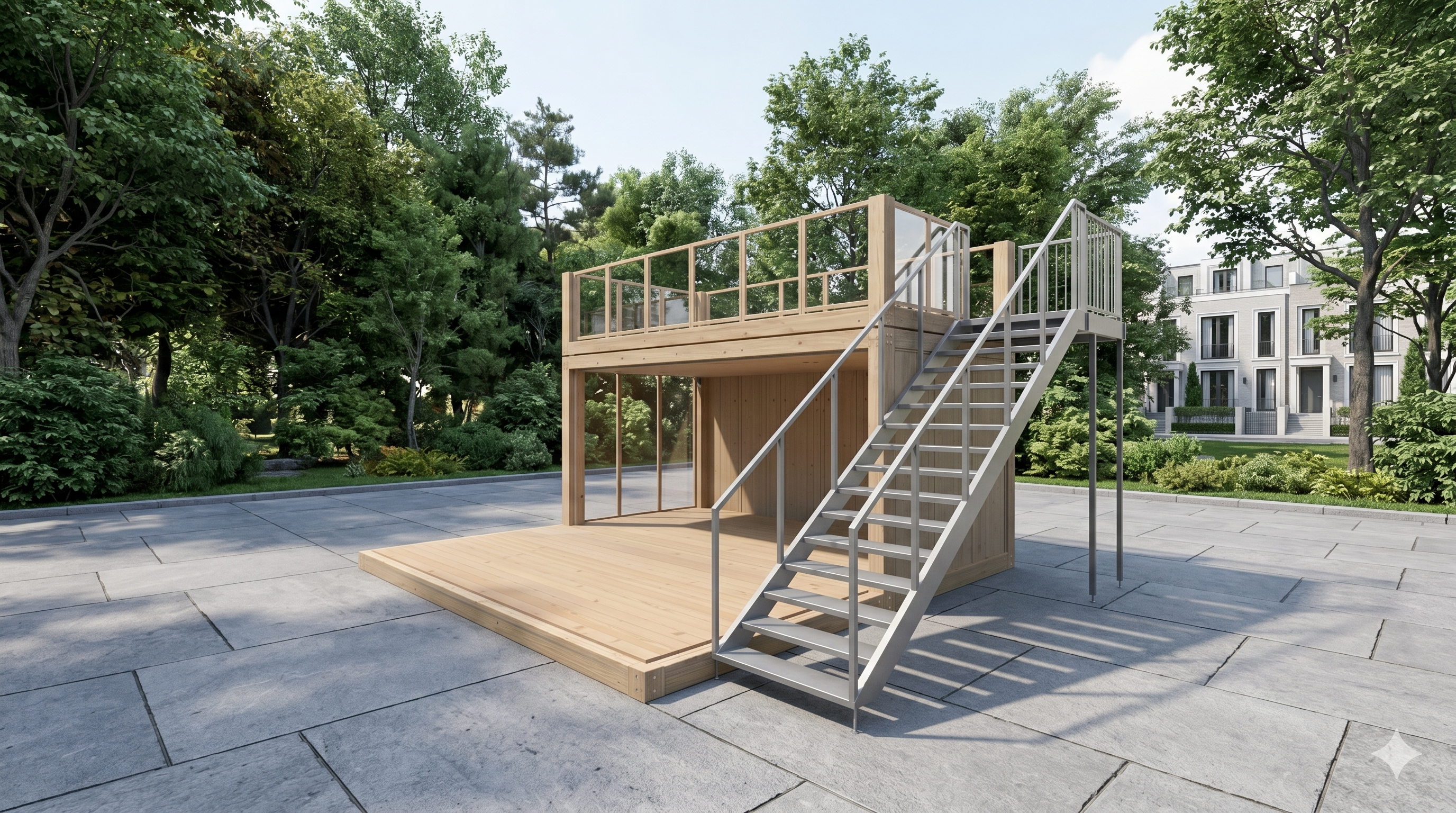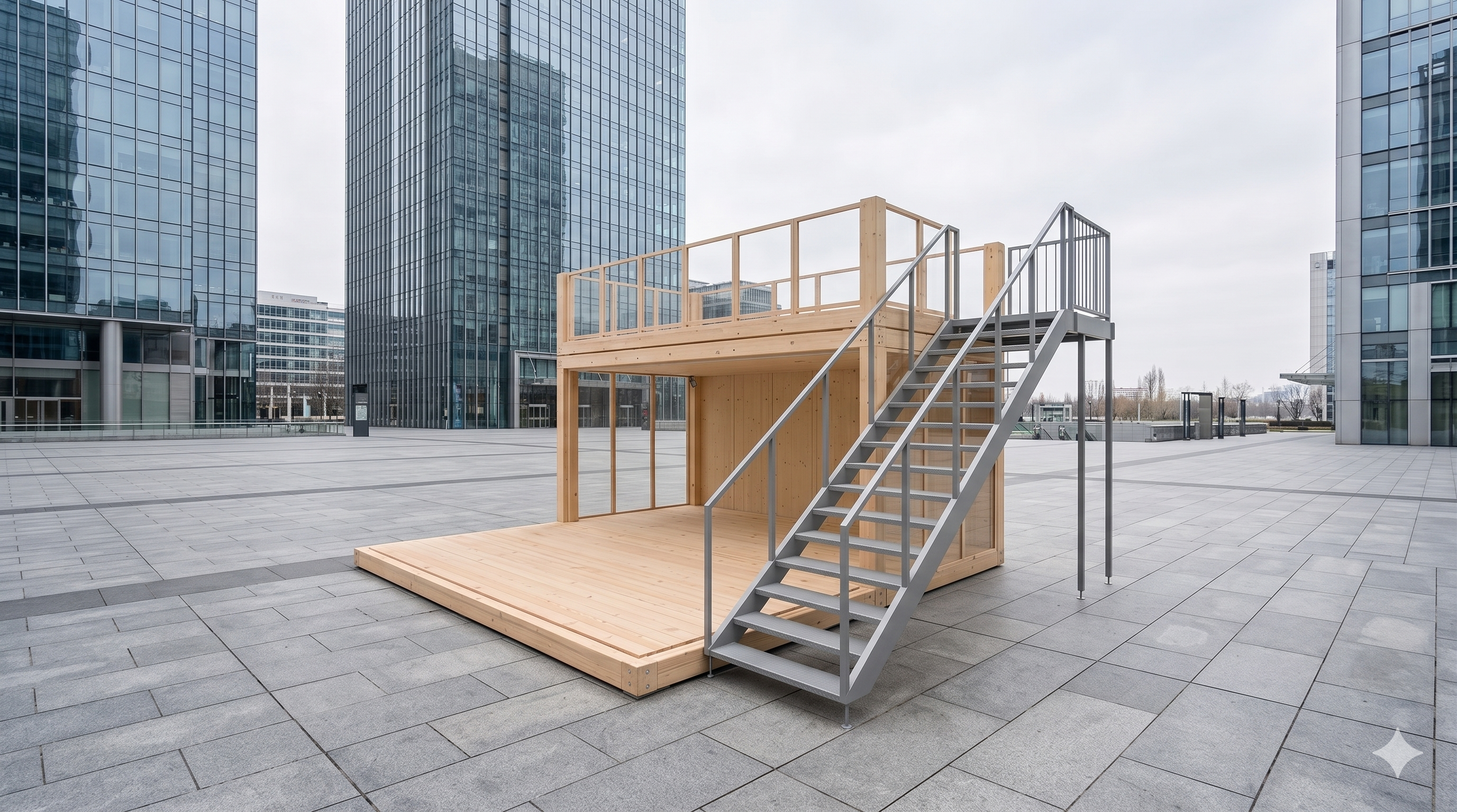 Der Woodline Entwurf 211 setzt neue Maßstäbe in der Kommunikation zwischen Marke und Besucher. Das zentrale Designelement ist die vollständig offene Frontpartie im Erdgeschoss, die Barrieren abbaut und eine direkte Interaktion mit der Umgebung fördert. Diese transparente Gestaltung macht das Modul zur idealen Wahl für hochfrequentierte Events, bei denen ein einladender Charakter entscheidend ist. Ergänzt durch die aufgesetzte Dachterrasse, die einen weitreichenden Ausblick garantiert, bietet dieser Eventcontainer eine hybride Raumlösung. Die Kombination aus warmem Holz und kühlem Glas schafft eine hochwertige Atmosphäre, die sich flexibel für Roadshows, Hospitality-Zonen oder exklusive Verkaufsflächen nutzen lässt.