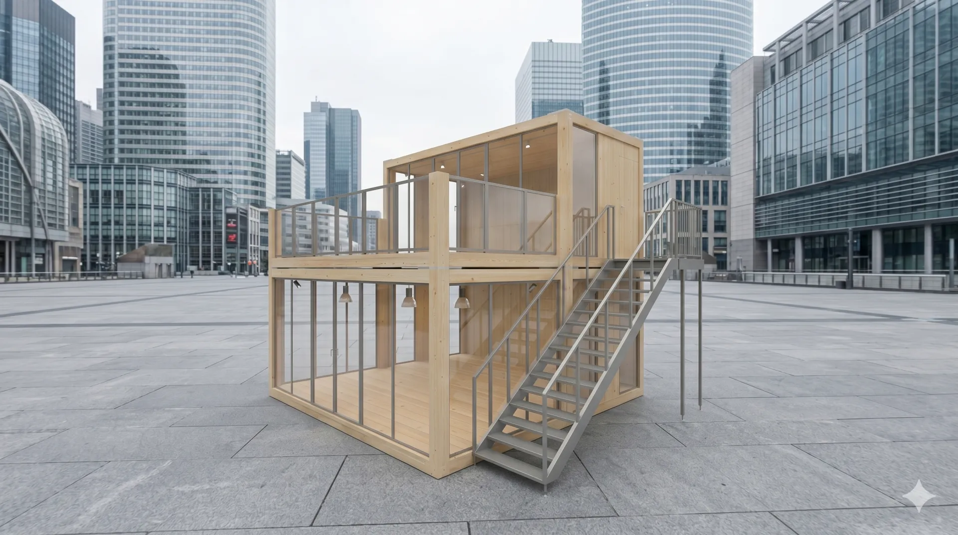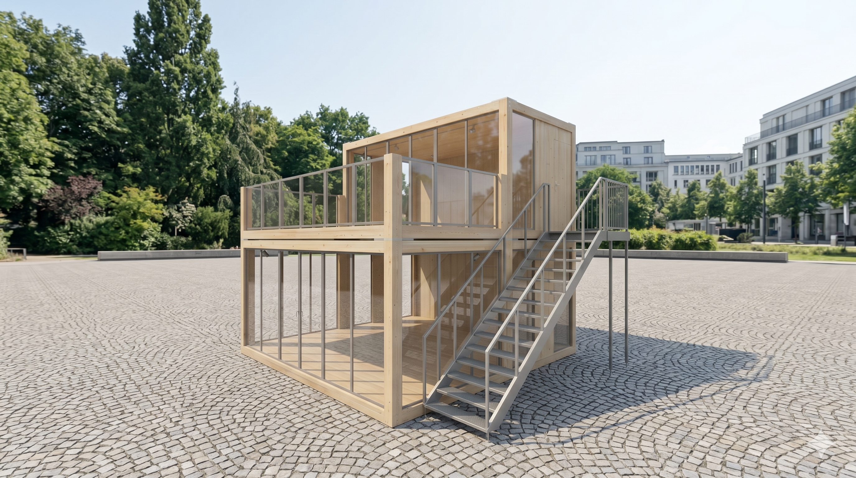 Der Eventcontainer Woodline Entwurf 212 ist eine zweigeschossige Holzrahmenkonstruktion, die für die Anforderungen moderner Veranstaltungsplanung entwickelt wurde. Das Modul kombiniert eine vollflächig verglaste Erdgeschosseinheit mit einem teilweise zurückgesetzten Obergeschoss, wodurch eine integrierte Dachterrasse entsteht. Die Verwendung von sichtbarem Konstruktionsholz bildet einen bewussten Kontrast zu klassischen Stahlcontainern und bietet eine natürliche Ästhetik für den Messebau, temporäre Showrooms oder Markenpräsentationen im Außenbereich. Durch die vertikale Ausrichtung ermöglicht das Modell eine funktionale Trennung zwischen öffentlichem Publikumsbereich unten und privaten Besprechungszonen auf der oberen Ebene, während die Glasfassaden für konstante Sichtachsen sorgen.