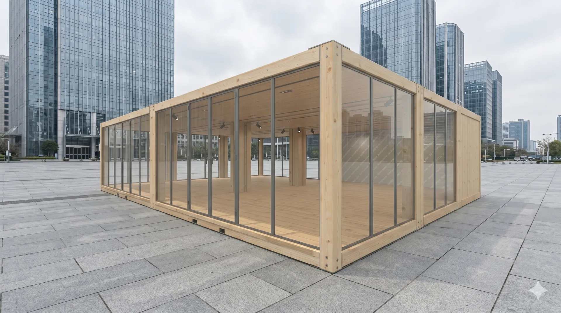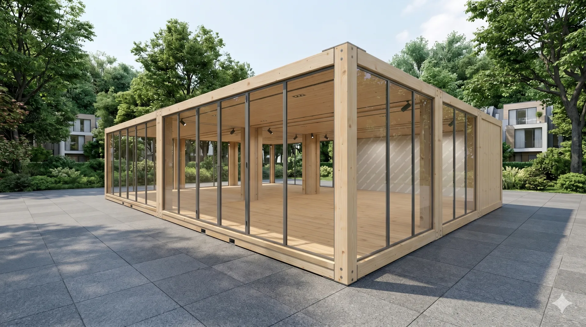 Das Holzmodul Woodline 215 definiert den klassischen Eventcontainer neu durch die Verbindung von natürlicher Ästhetik und modularer Flexibilität. Die Konstruktion aus hochwertigem Massivholz bietet eine warme Atmosphäre, die sich deutlich von Standard-Stahlsystemen abhebt. Großflächige Glasfronten sorgen für maximale Transparenz und eine fließende Verbindung zwischen Innen- und Außenraum. Ob als exklusiver Pop-up-Store, repräsentativer Messestand oder eleganter Empfangsbereich – dieses Modul lässt sich flexibel an verschiedene Anforderungen anpassen. Dank der robusten Rahmenbauweise erfüllt der Woodline 215 höchste Ansprüche an Stabilität und Design im modernen Veranstaltungsbau.