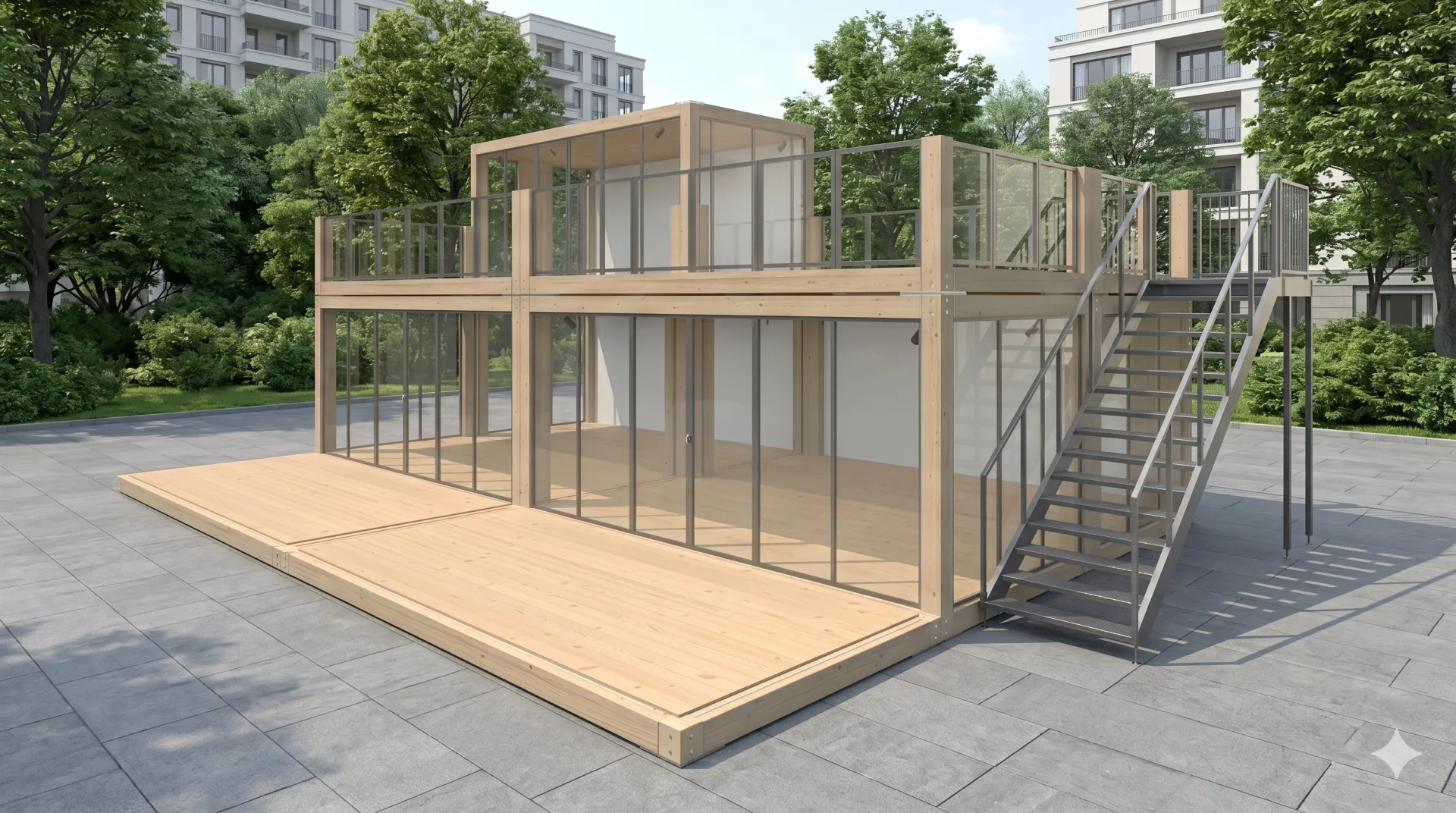 Nachhaltige Materialwahl: Die tragende Struktur aus Vollholz bietet eine natürliche Haptik und eine im Vergleich zu Standard-Containern deutlich hochwertigere Außenwirkung.