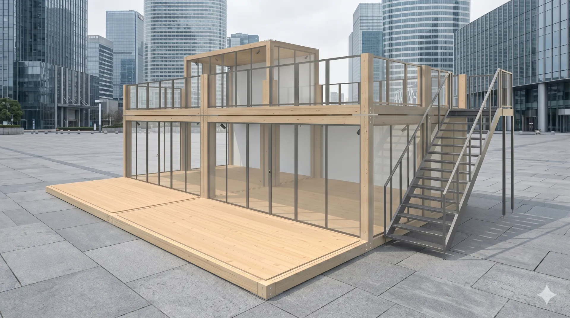 Der Eventcontainer Holzmodul Woodline 218 stellt eine architektonisch anspruchsvolle Lösung für temporäre Markeninszenierungen dar. Die Konstruktion basiert auf einem sichtbaren Echtholz-Rahmensystem, das durch großflächige Glaselemente ergänzt wird, um eine offene und einladende Atmosphäre zu schaffen. Das Erdgeschoss bietet einen geschützten Raum für Präsentationen oder Beratungen, während das über eine Außentreppe erreichbare Oberdeck als offene Plattform für Networking und Ausblick dient. Dank der modularen Bauweise lässt sich das Woodline 218 flexibel in bestehende Event-Infrastrukturen integrieren oder als solitäres Highlight einsetzen.