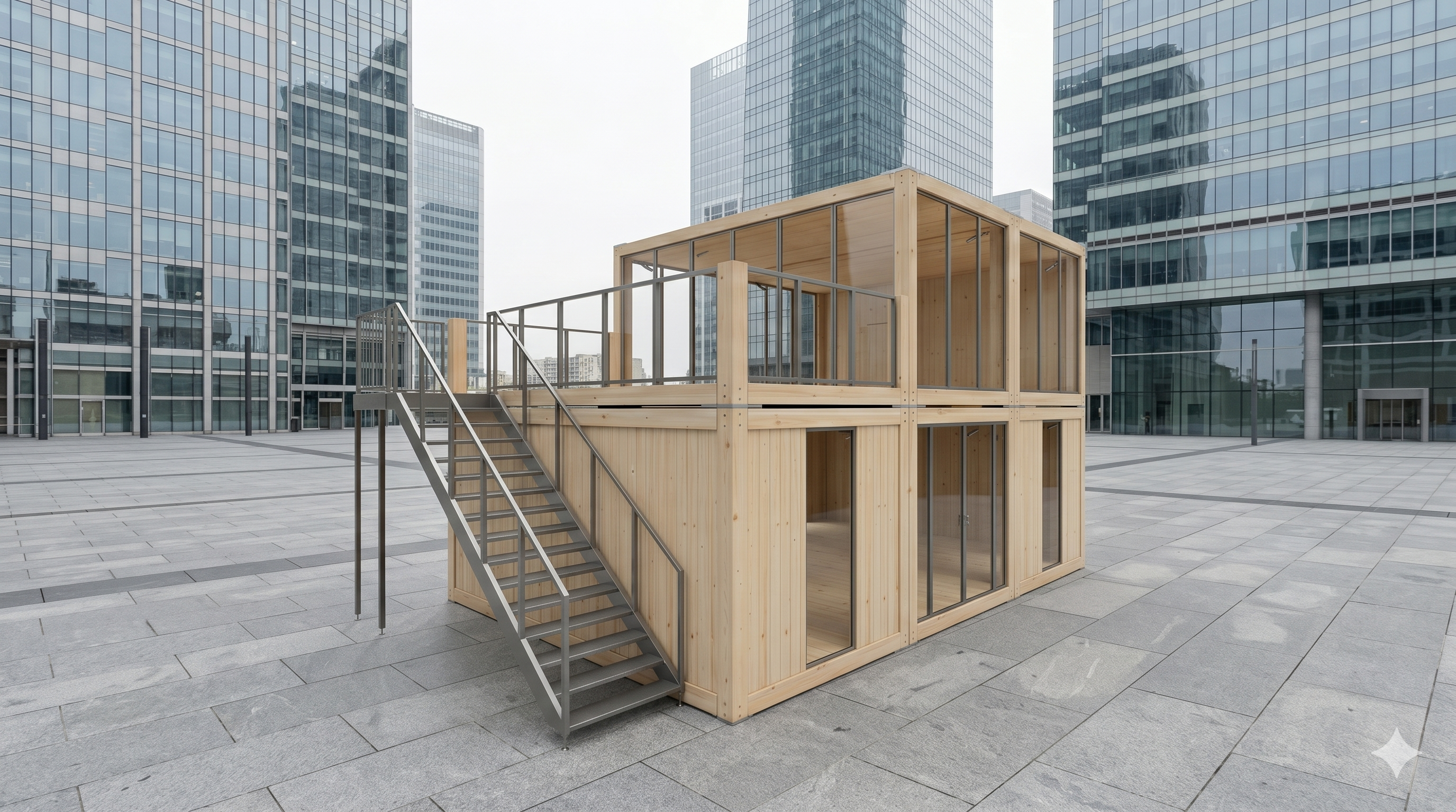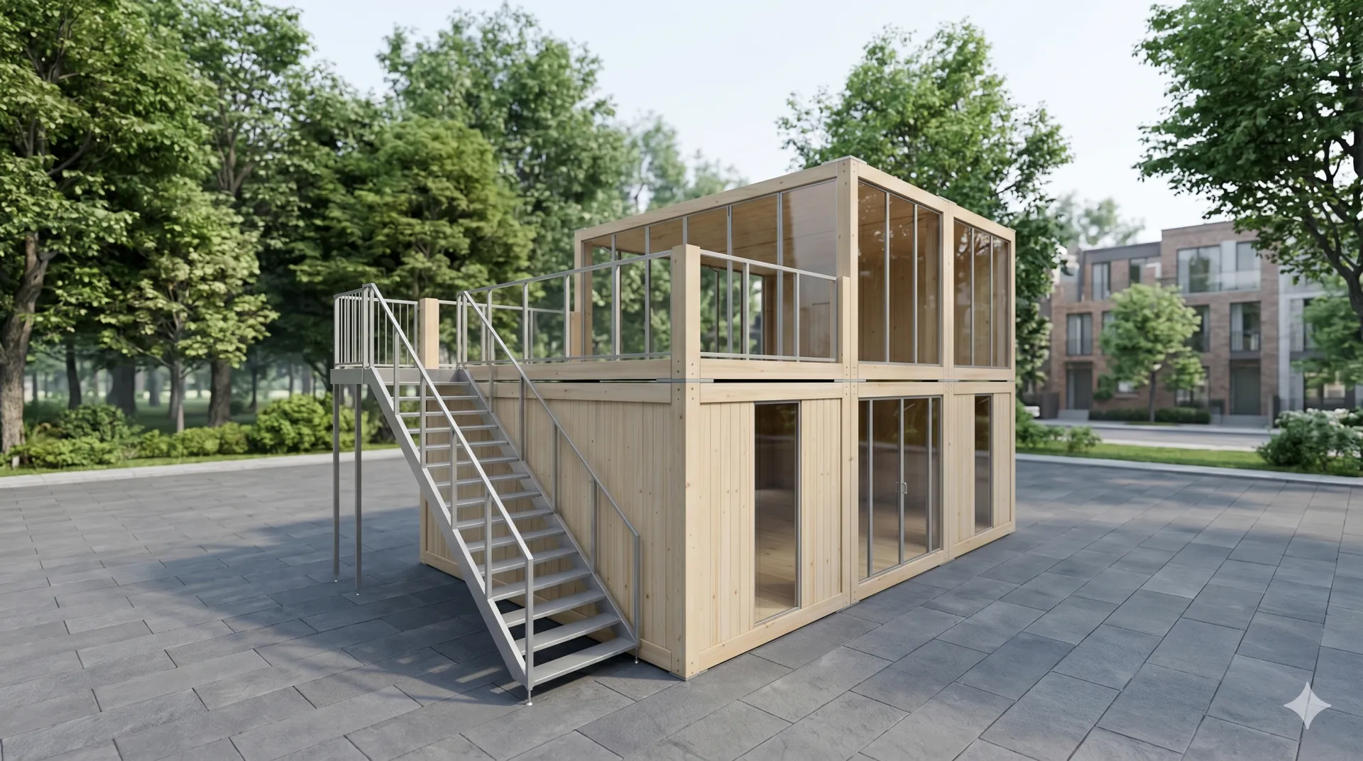 Der Woodline Entwurf 219 kombiniert moderne Holzarchitektur mit der Flexibilität modularer Raumsysteme. Durch die Verwendung hochwertiger Echtholz-Fassaden und großflächiger Glaselemente schafft dieses Modell eine einladende, natürliche Atmosphäre, die sich deutlich von Standard-Stahlcontainern abhebt. Die zweistöckige Konstruktion mit integrierter Dachterrasse maximiert die nutzbare Fläche auf begrenztem Raum und bietet Besuchern eine attraktive Aussichtsebene. Ob als repräsentativer Messestand, hochwertiger Pop-up-Store oder exklusiver VIP-Bereich bei Open-Air-Veranstaltungen – der Woodline Entwurf 219 fungiert als architektonisches Highlight, das Ästhetik und Funktionalität für anspruchsvolle Event-Projekte vereint.
