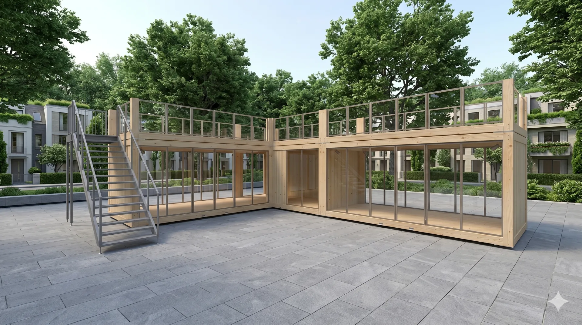 Der Eventcontainer Woodline Entwurf 230 ist die ideale Lösung, um eine natürliche Optik mit viel Nutzfläche zu verbinden. Das Besondere an diesem Holzmodul ist seine L-Form: Zwei Container-Einheiten sind über Eck verbunden, wodurch eine geschützte Fläche vor dem Eingang entsteht. Die gesamte Front besteht aus stabilen Glaselementen, die viel Licht hereinlassen und den Blick auf Ihre Produkte freigeben. Durch die Verwendung von hellem Holz wirkt der Stand freundlich und einladend. Ob als Infostand, mobiler Verkaufsshop oder Messebüro – dieser Eventcontainer bietet durch seine clevere Aufteilung und die zusätzliche Dachterrasse maximale Flexibilität auf zwei Ebenen.